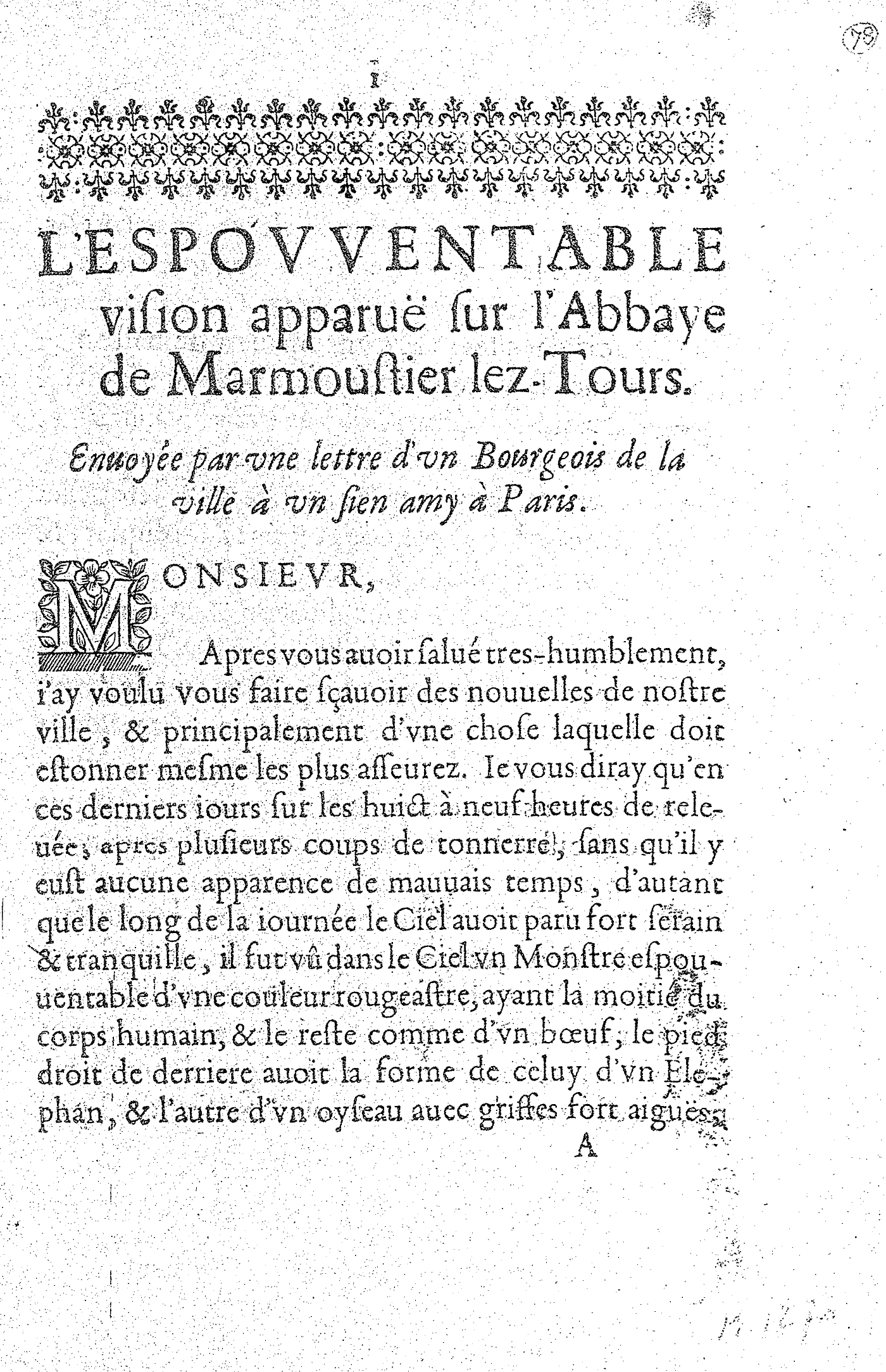 L’ESPOVVENTABLE vision apparuë sur l’Abbaye de Marmoustier lez-Tours. Enuoyée par vne lettre d’vn Bourgeois de la ville à vn sien amy à Paris.