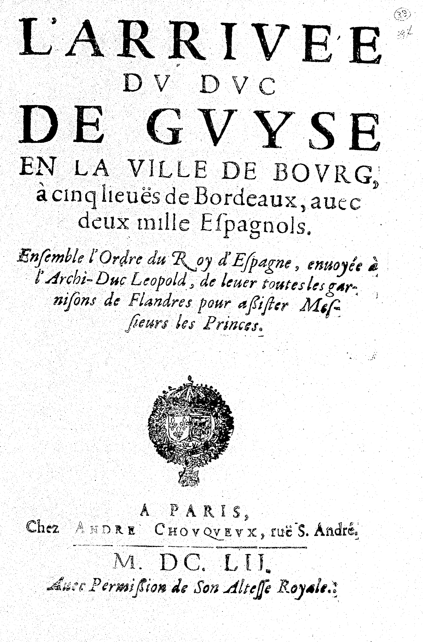 L’ARRIVÉE DV DVC DE GVYSE EN LA VILLE DE BOVRG, à cinq lieuës de Bordeaux, auec deux mille Espagnols. Ensemble l’Ordre du Roy d’Espagne, enuoyée à l’Archi-Duc Leopold, de leuer toutes les garnisons de Flandres pour assister Messieurs les Princes. Auteur : Anonyme