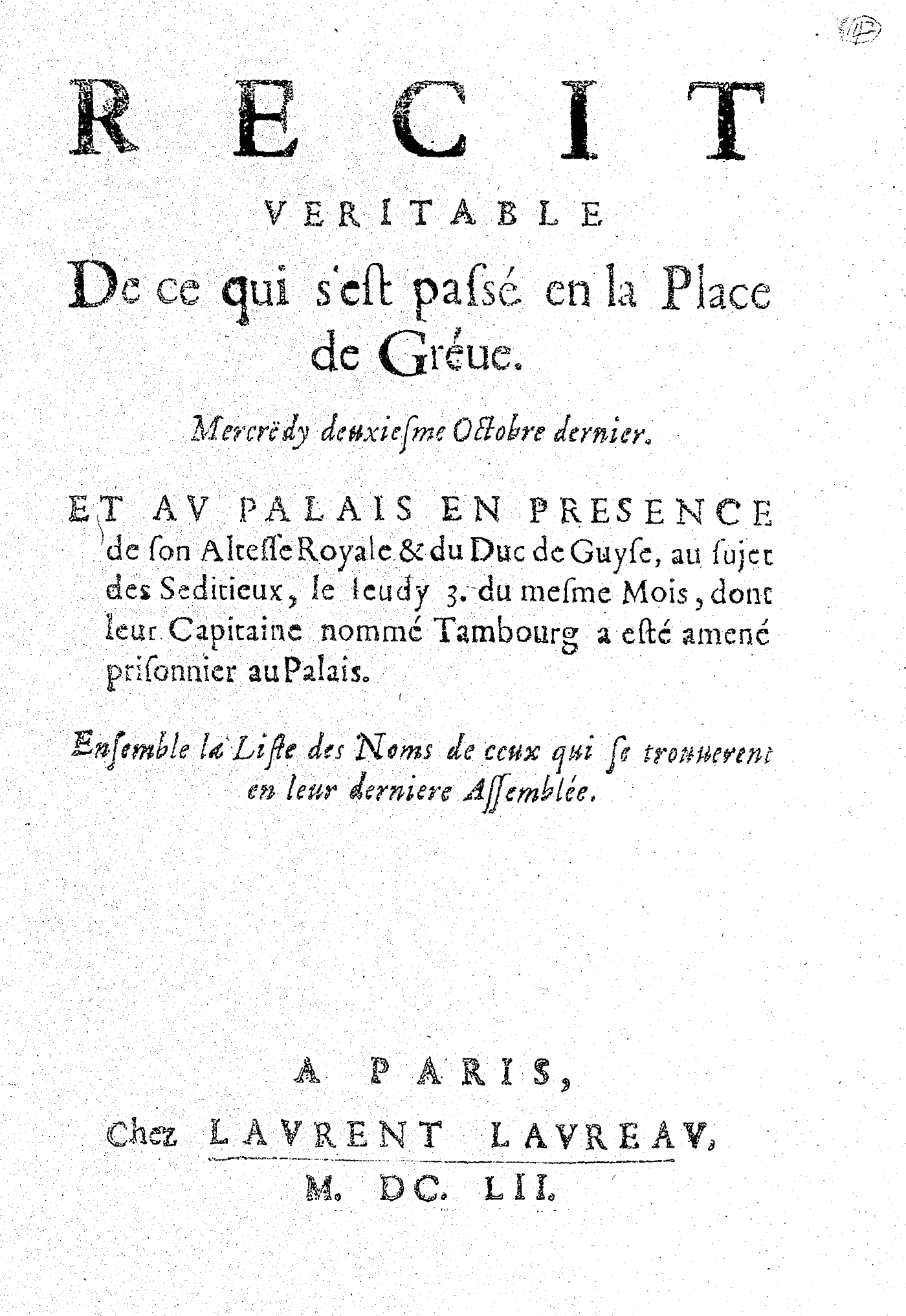 RECIT VERITABLE De ce qui s’est passé en la Place de Gréue. Mercrëdy deuxiesme Octobre dernier. ET AV PALAIS EN PRESENCE de son Altesse Royale & du Duc de Guyse, au sujet des Seditieux, le Ieudy 3. du mesme Mois, dont leur Capitaine nommé Tambourg a esté amené prisonnier au Palais. Ensemble la Liste des Noms de ceux qui se trouuerent en leur derniere Assemblée. Auteur : Anonyme