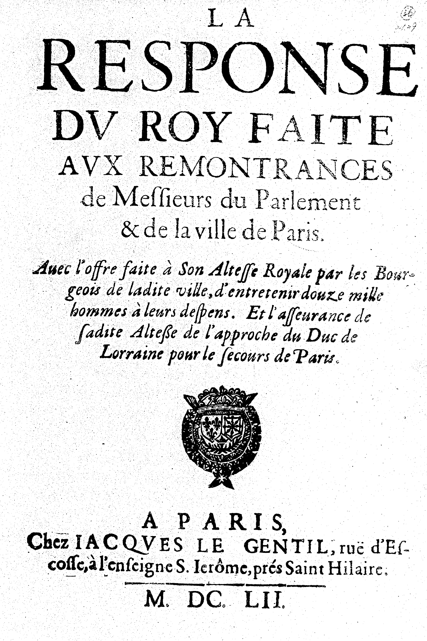LA RESPONSE DV ROY FAITE AVX REMONTRANCES de Messieurs du Parlement & de la ville de Paris. Auec l’offre faite à Son Altesse Royale par les Bourgeois de ladite ville, d’entretenir douze mille hommes à leurs despens. Et l’asseurance de sadite Altesse de l’approche du Duc de Lorraine pour le secours de Paris. Auteur : Anonyme