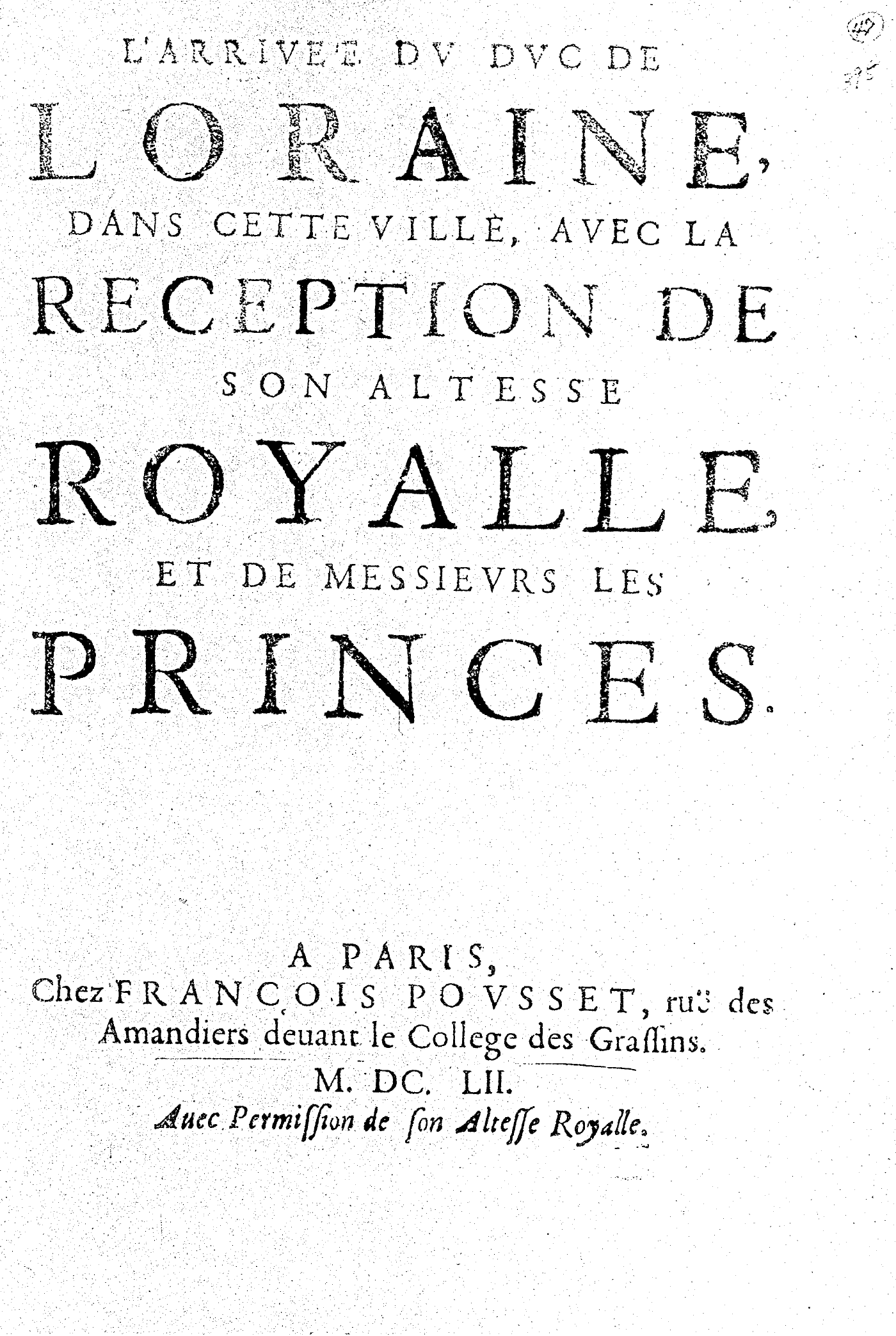 L’ARRIVÉE DV DVC DE LORAINE, DANS CETTE VILLE, AVEC LA RECEPTION DE SON ALTESSE ROYALLE, ET DE MESSIEVRS LES PRINCES. Auteur : Anonyme