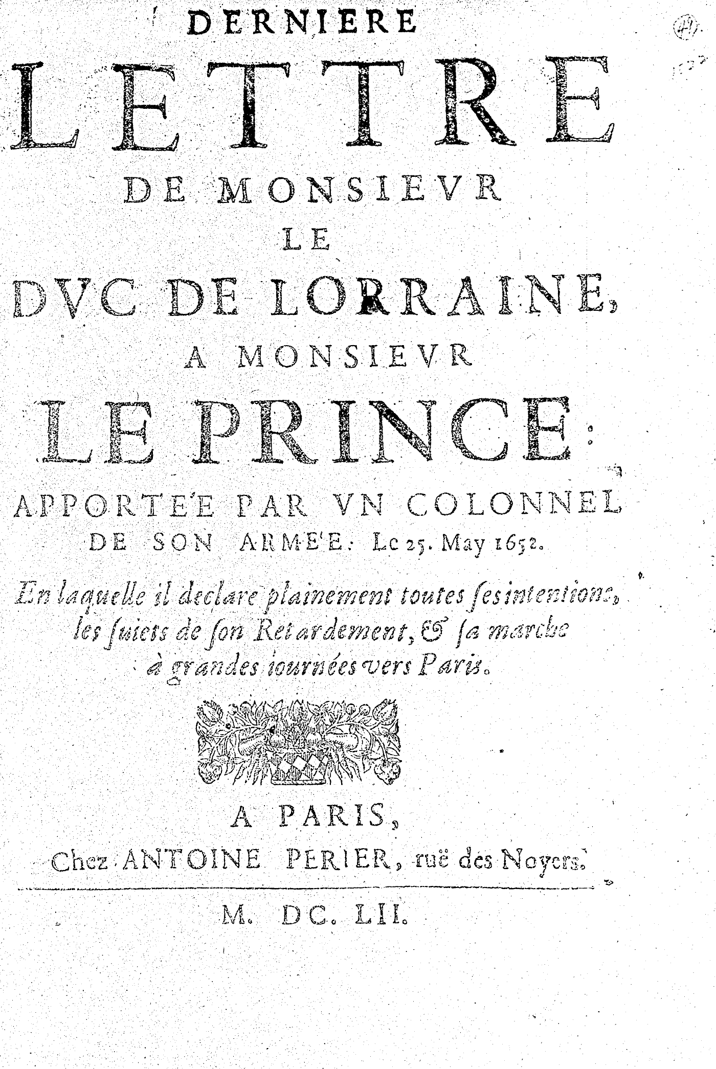 DERNIERE LETTRE DE MONSIEVR LE DVC DE LORRAINE, A MONSIEVR LE PRINCE : APPORTÉE PAR VN COLONNEL DE SON ARMÉE : Le 25. May 1652. En laquelle il declare plainement toutes ses intentions, les suiets de son Retardement, & sa marche à grandes iournées vers Paris. Auteur : Lorraine, Charles de [signé]