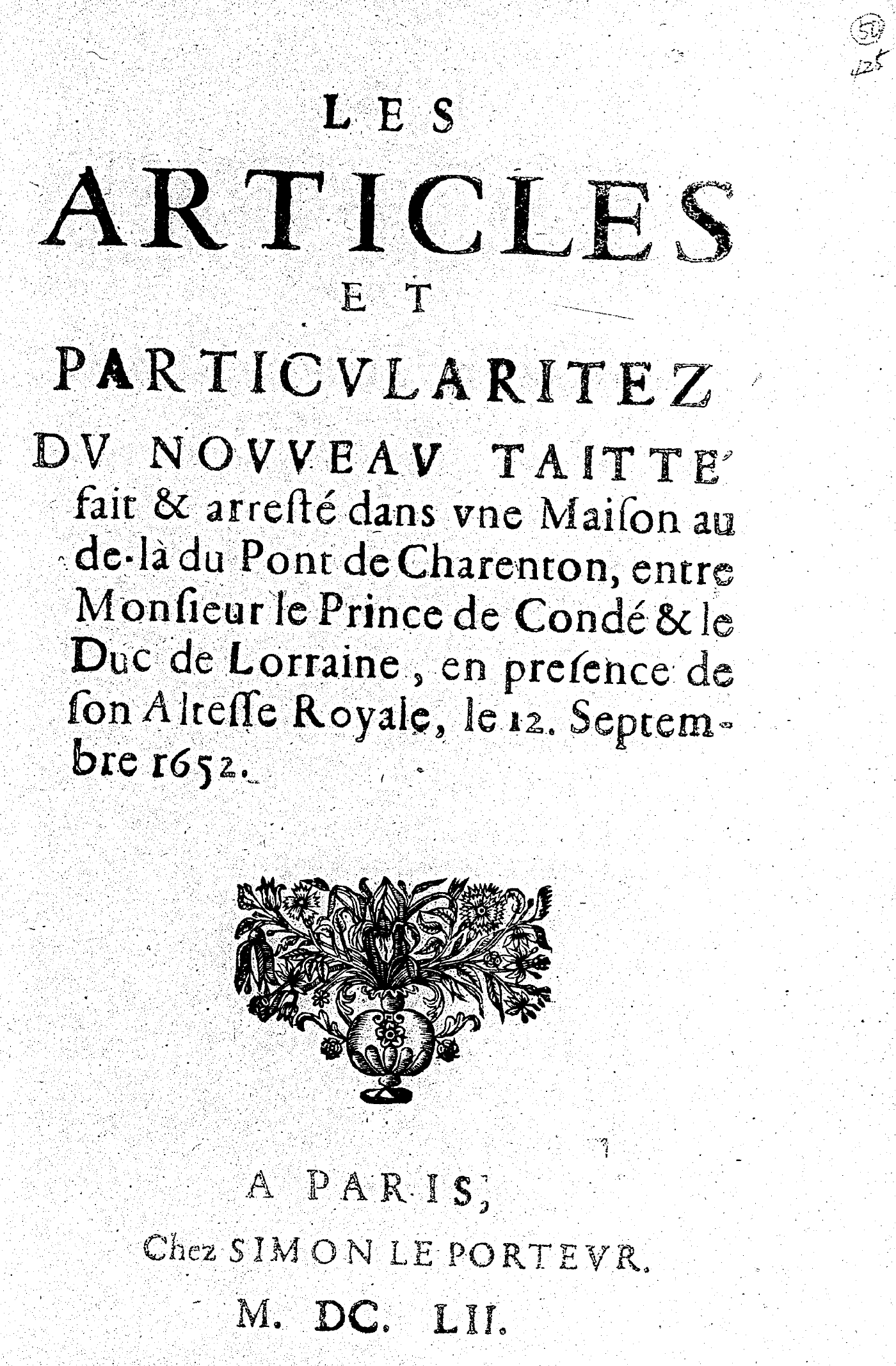 LES ARTICLES ET PARTICVLARITEZ DV NOVVEAV TAITTÉ fait & arresté dans vne Maison au de-là du Pont de Charenton, entre Monsieur le Prince de Condé & le Duc de Lorraine, en presence de son Altesse Royale, le 12. Septembre 1652. Auteur : Anonyme