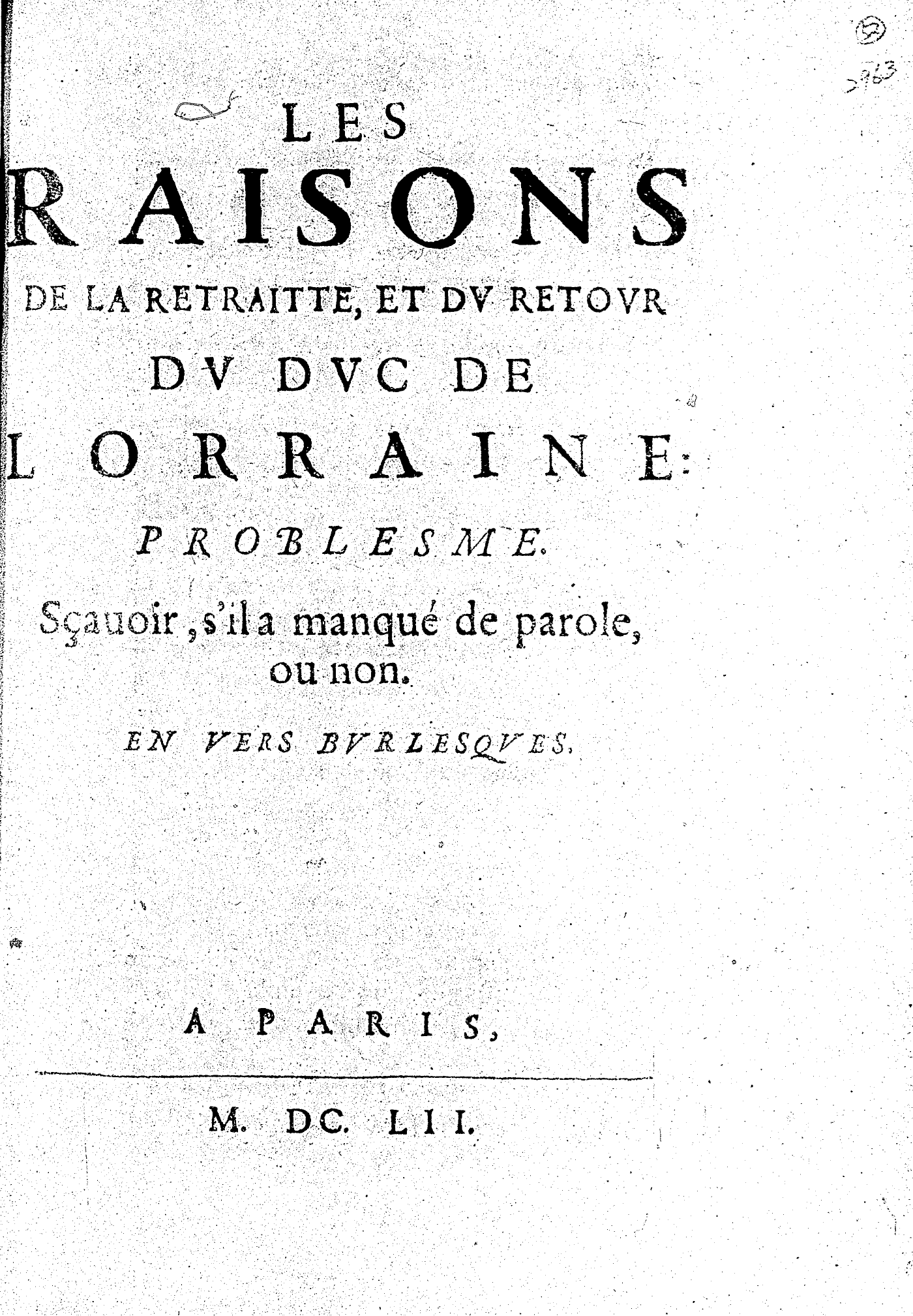 LES RAISONS DE LA RETRAITTE, ET DV RETOVR DV DVC DE LORRAINE : PROBLESME. Sçauoir, s’il a manqué de parole, ou non. EN VERS BVRLESQVES. Auteur : Anonyme