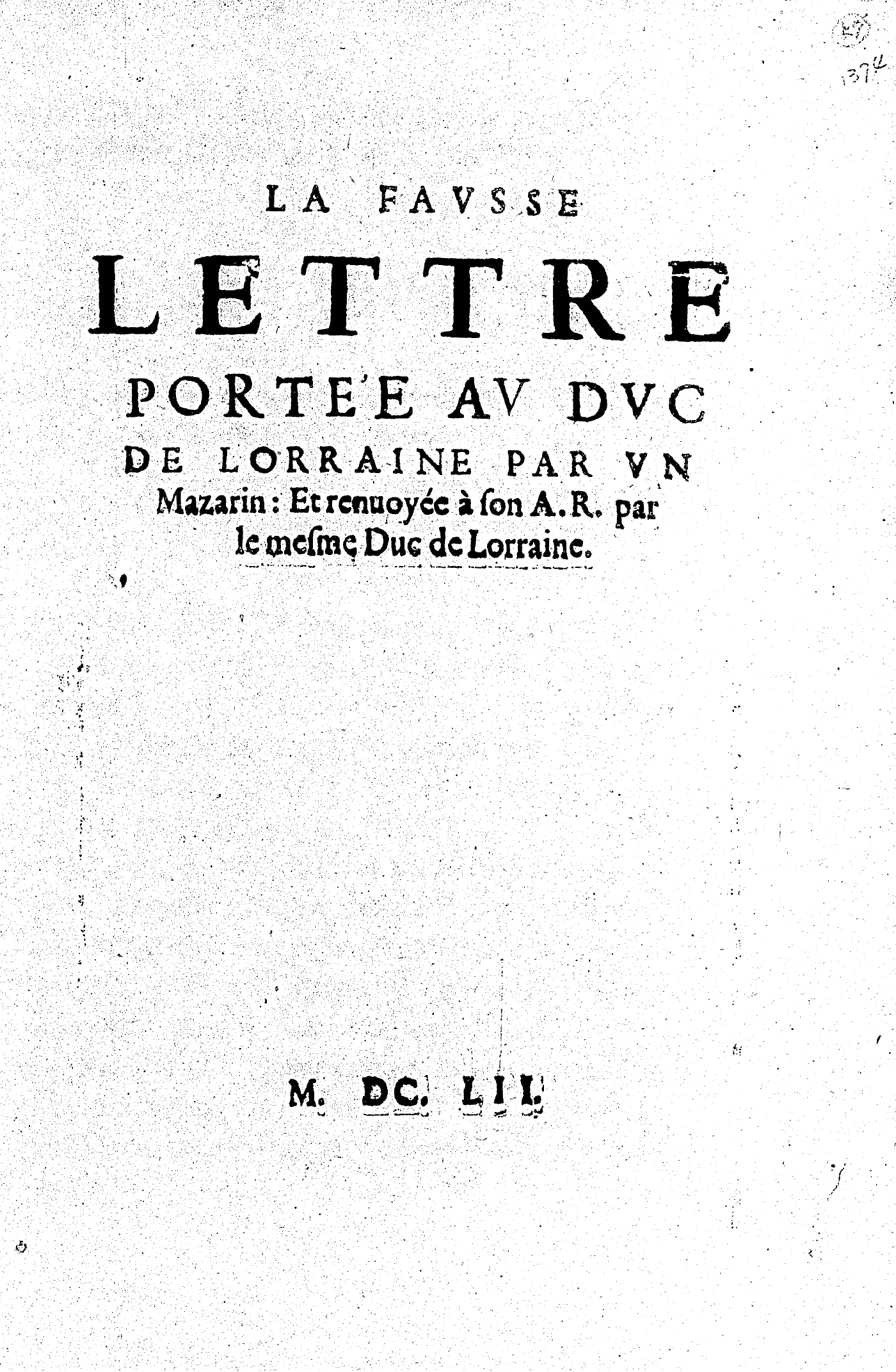 LA FAVSSE LETTRE PORTÉE AV DVC DE LORRAINE PAR VN Mazarin : Et renuoyée à son A. R. par le mesme Duc de Lorraine. Auteur : Anonyme