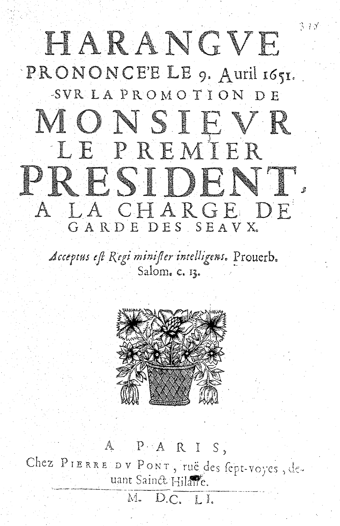 HARANGVE PRONONCÉE LE 9. Auril 1651. SVR LA PROMOTION DE MONSIEVR LE PREMIER PRESIDENT, A LA CHARGE DE GARDE DES SEAVX. Auteur : Anonyme