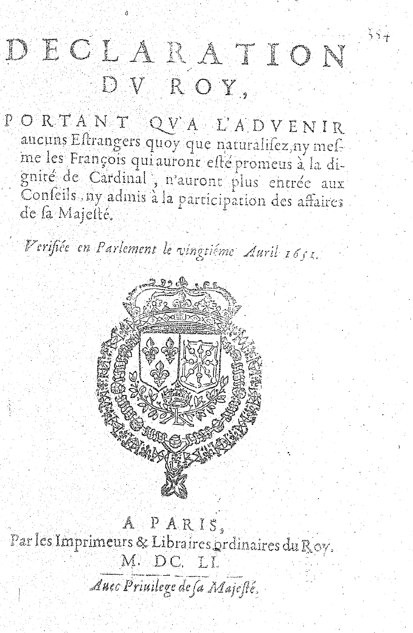DECLARATION DV ROY, PORTANT QV’A L’ADVENIR aucuns Estrangers quoy que naturalisez, ny mesme les François qui auront esté promeus à la dignité de Cardinal, n’auront plus entrée aux Conseils ny admis à la participation des affaires de sa Majesté. Auteur : Louis (XIV), De Guénégaud, Guyet [signé]