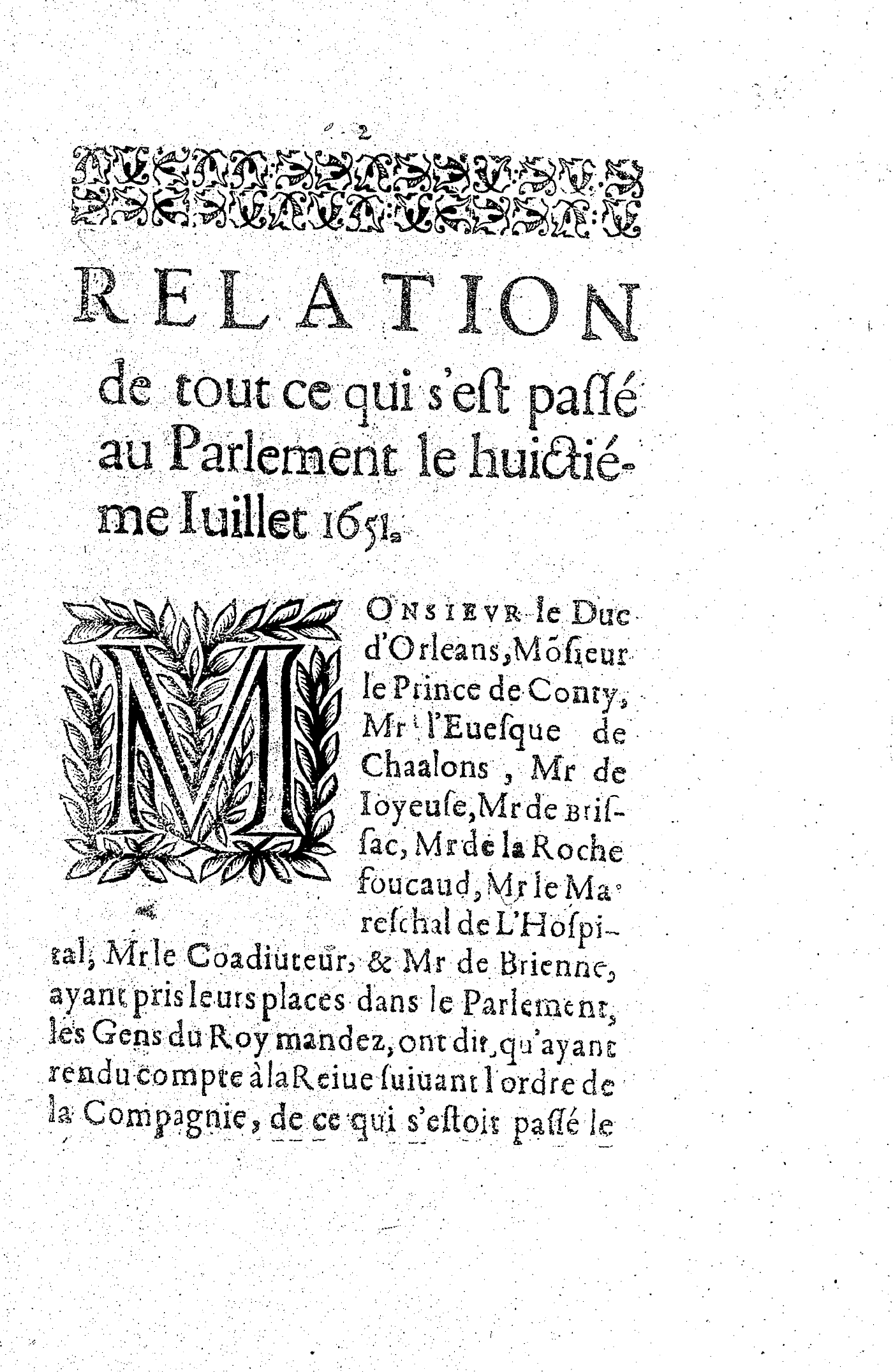 RELATION de tout ce qui s’est passé au Parlement le huictiéme Iuillet 1651. Auteur : Anonyme