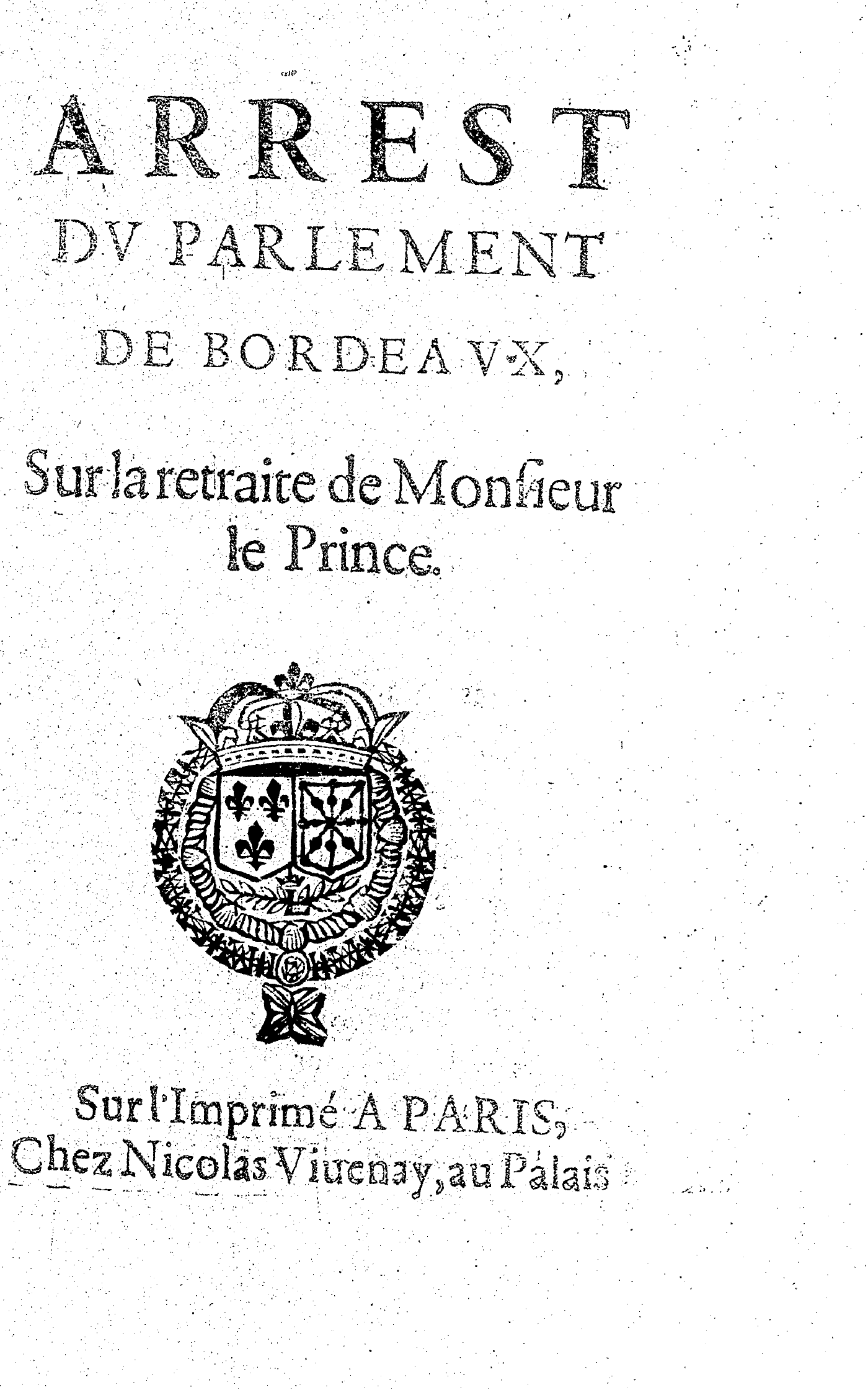 ARREST DV PARLEMENT DE BORDEAVX, Sur la retraite de Monsieur le Prince. Auteur : Suau [signé]