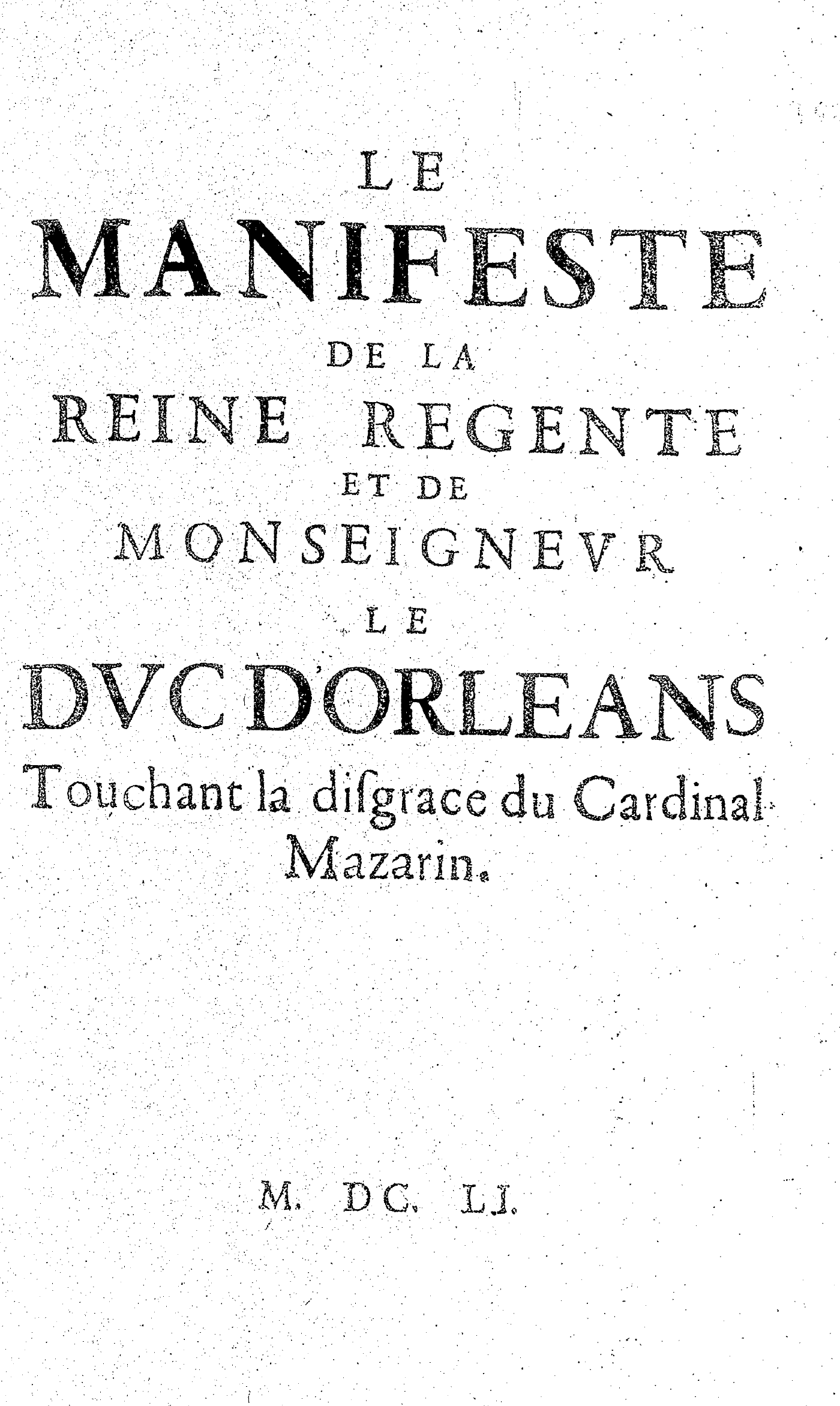 LE MANIFESTE DE LA REINE REGENTE ET DE MONSEIGNEVR LE DVC D’ORLEANS Touchant la disgrace du Cardinal Mazarin. Auteur : Anonyme