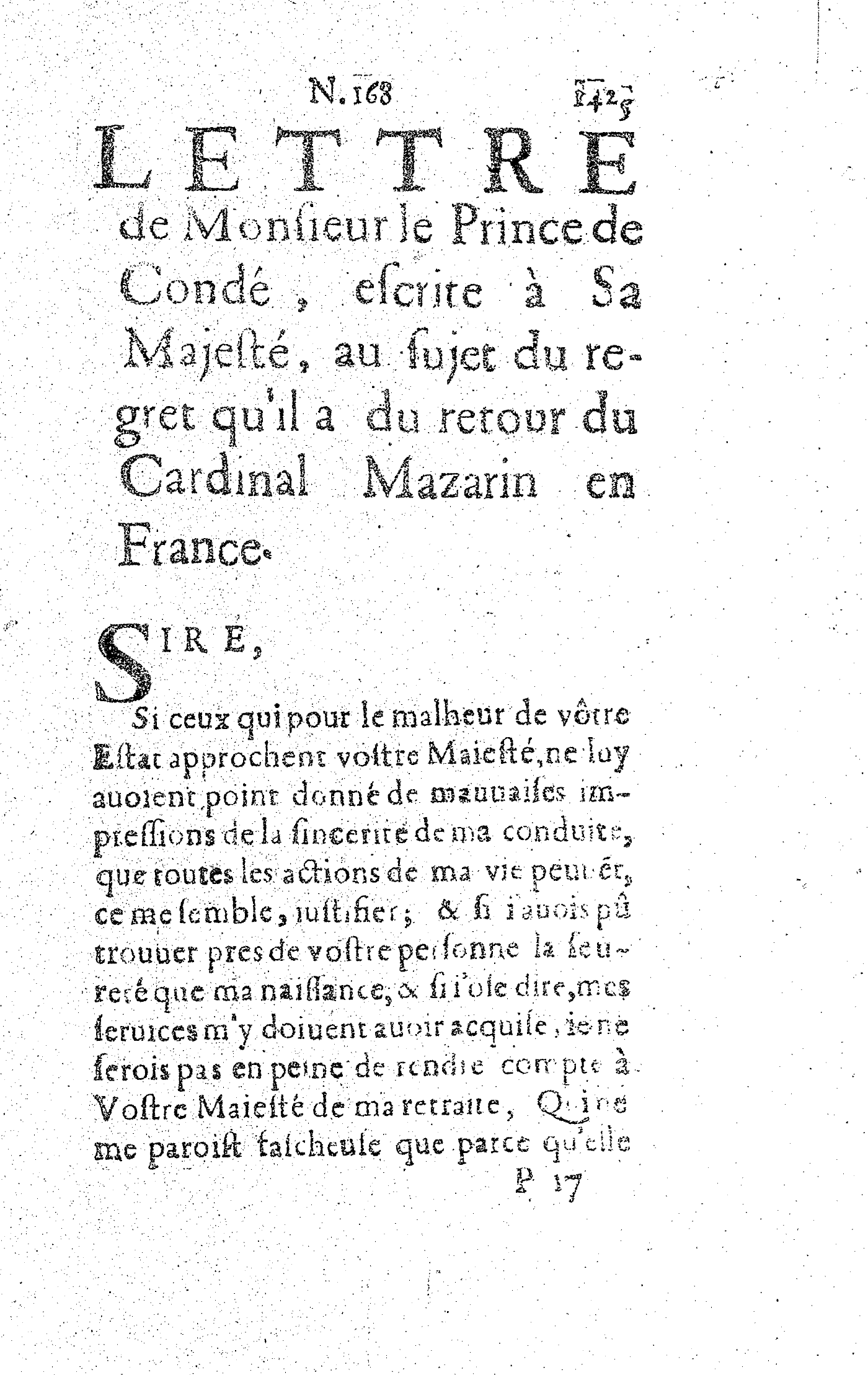 LETTRE de Monsieur le Prince de Condé, escrite à Sa Majesté, au sujet du regret qu’il a du retour du Cardinal Mazarin en France. Auteur : Bourbon-Condé, Louis II de (prince de Condé) [signé]