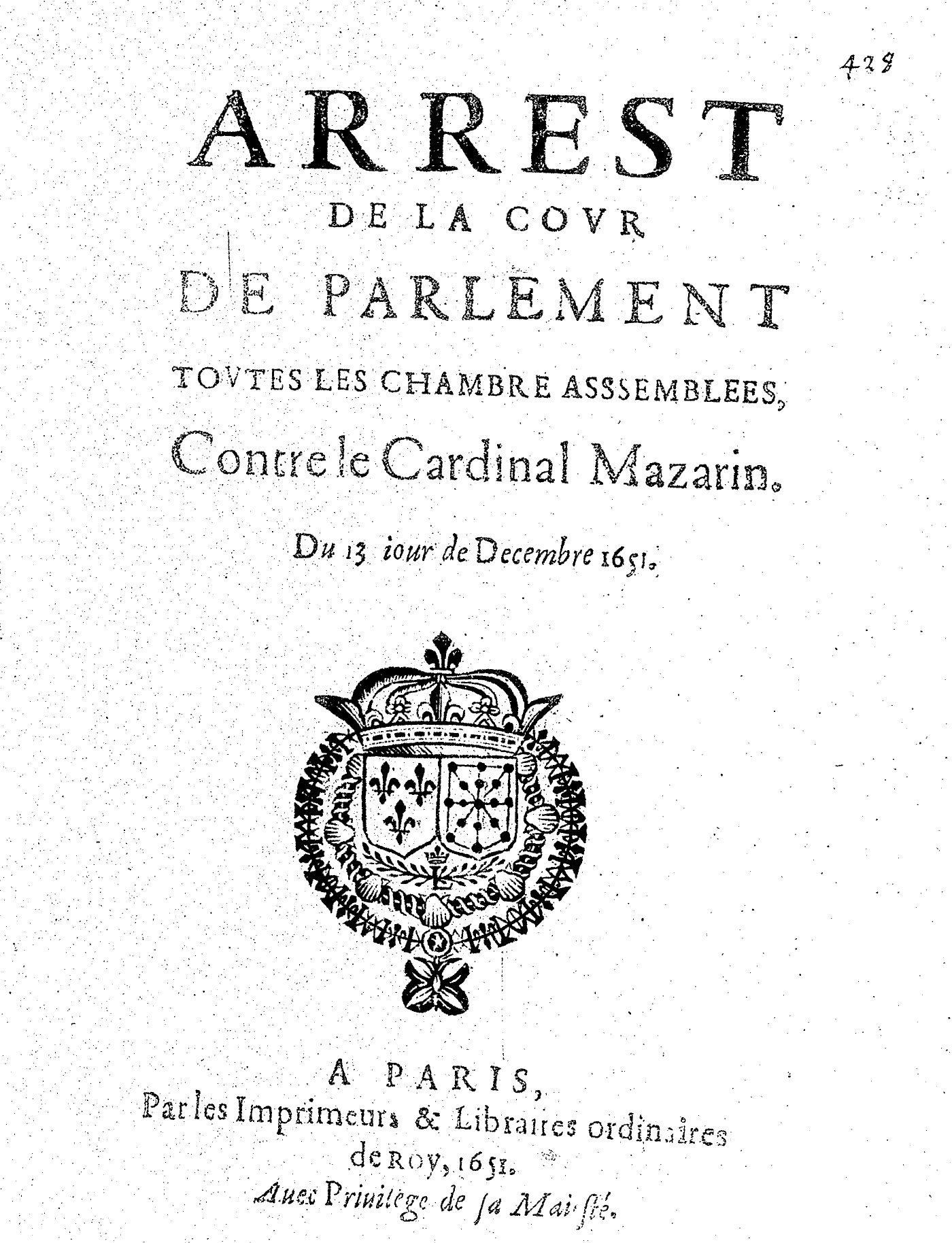 ARREST DE LA COVR DE PARLEMENT : Donné contre le Cardinal Mazarin. Auteur : Du Tillet [signé]