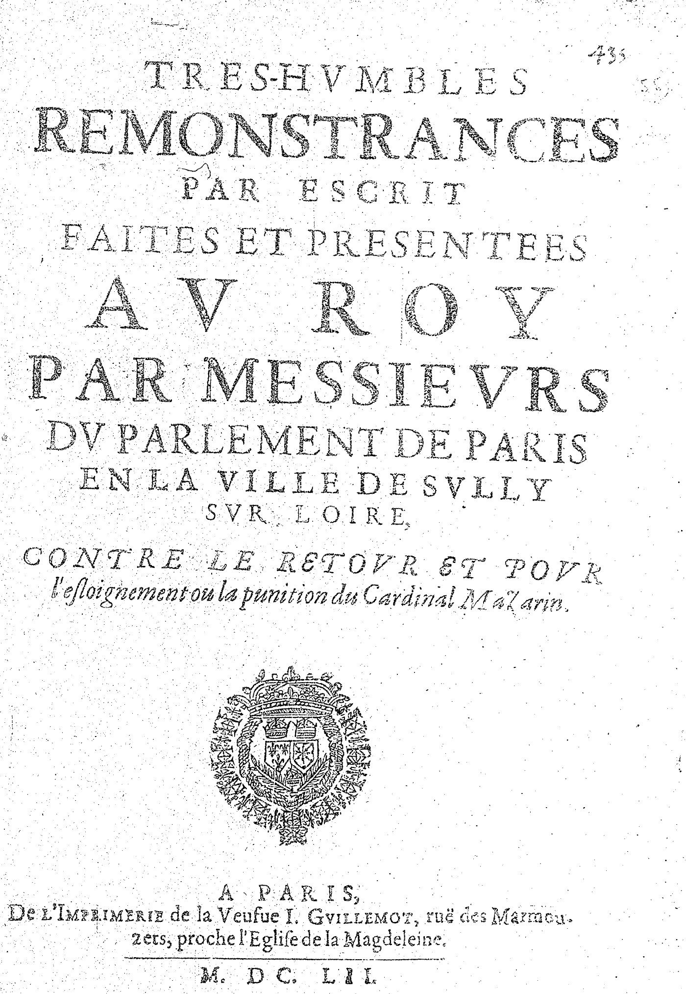 TRES-HVMBLES REMONSTRANCES PAR ESCRIT FAITES ET PRESENTEES AV ROY PAR MESSIEVRS DV PARLEMENT DE PARIS EN LA VILLE DE SVLLY SVR LOIRE, CONTRE LE RETOVR ET POVR l’esloignement ou la punition du Cardinal Mazarin. Auteur : Du Tillet [signé]