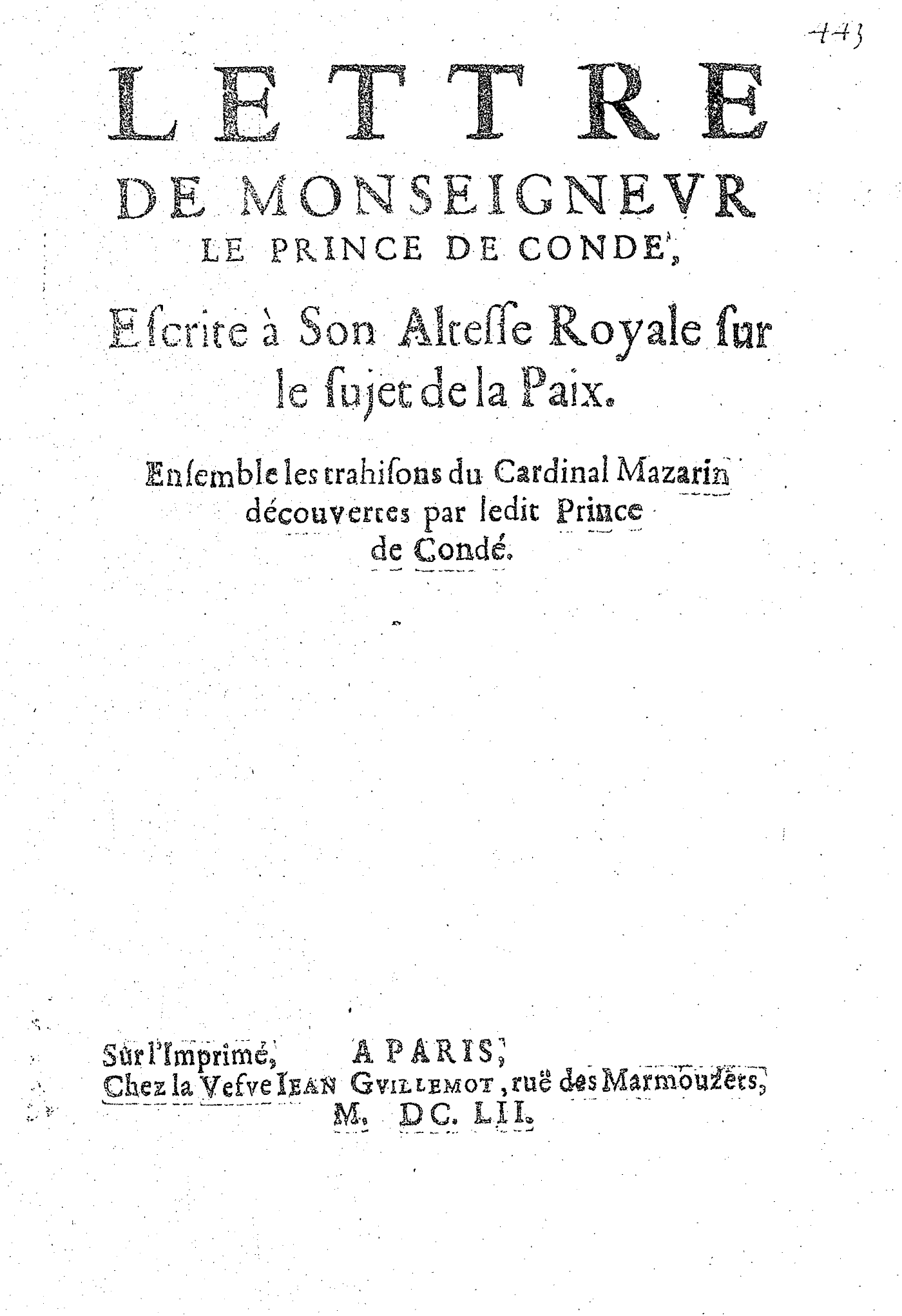 LETTRE DE MONSEIGNEVR LE PRINCE DE CONDÉ, Escrite à Son Altesse Royale sur le sujet de la Paix. Ensemble les trahisons du Cardinal Mazarin découvertes par ledit Prince de Condé. Auteur : Bourbon, Louis de [signé]