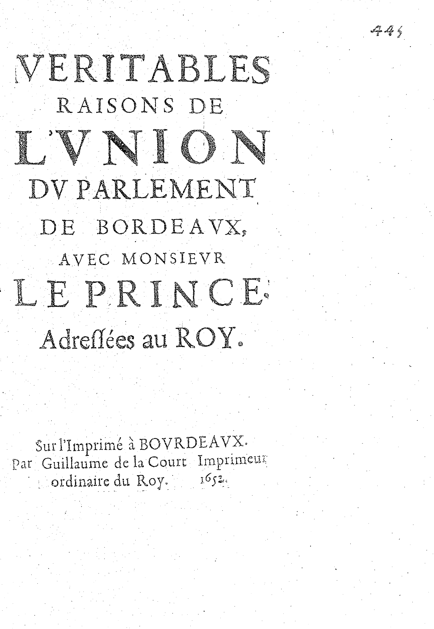 VERITABLES RAISONS DE L’VNION DV PARLEMENT DE BORDEAVX, AVEC MONSIEVR LE PRINCE. Adressées au Roy. Auteur : Anonyme
