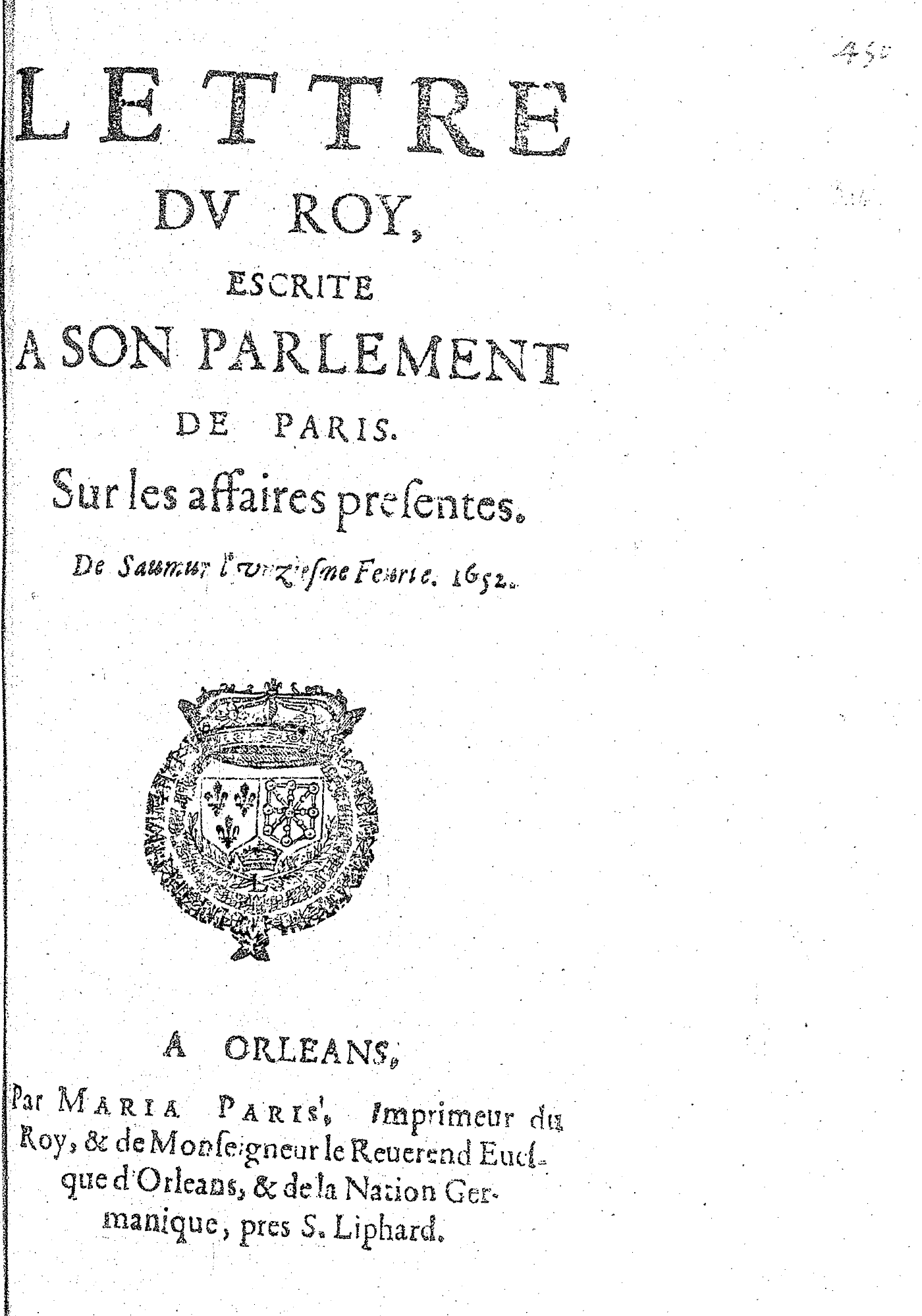 LETTRE DV ROY, ESCRITE A SON PARLEMENT DE PARIS. Sur les affaires presentes. De Saumur l’vniziesme Feurier. 1652. Auteur : Louis (XIV), De Guénégaud [signé]