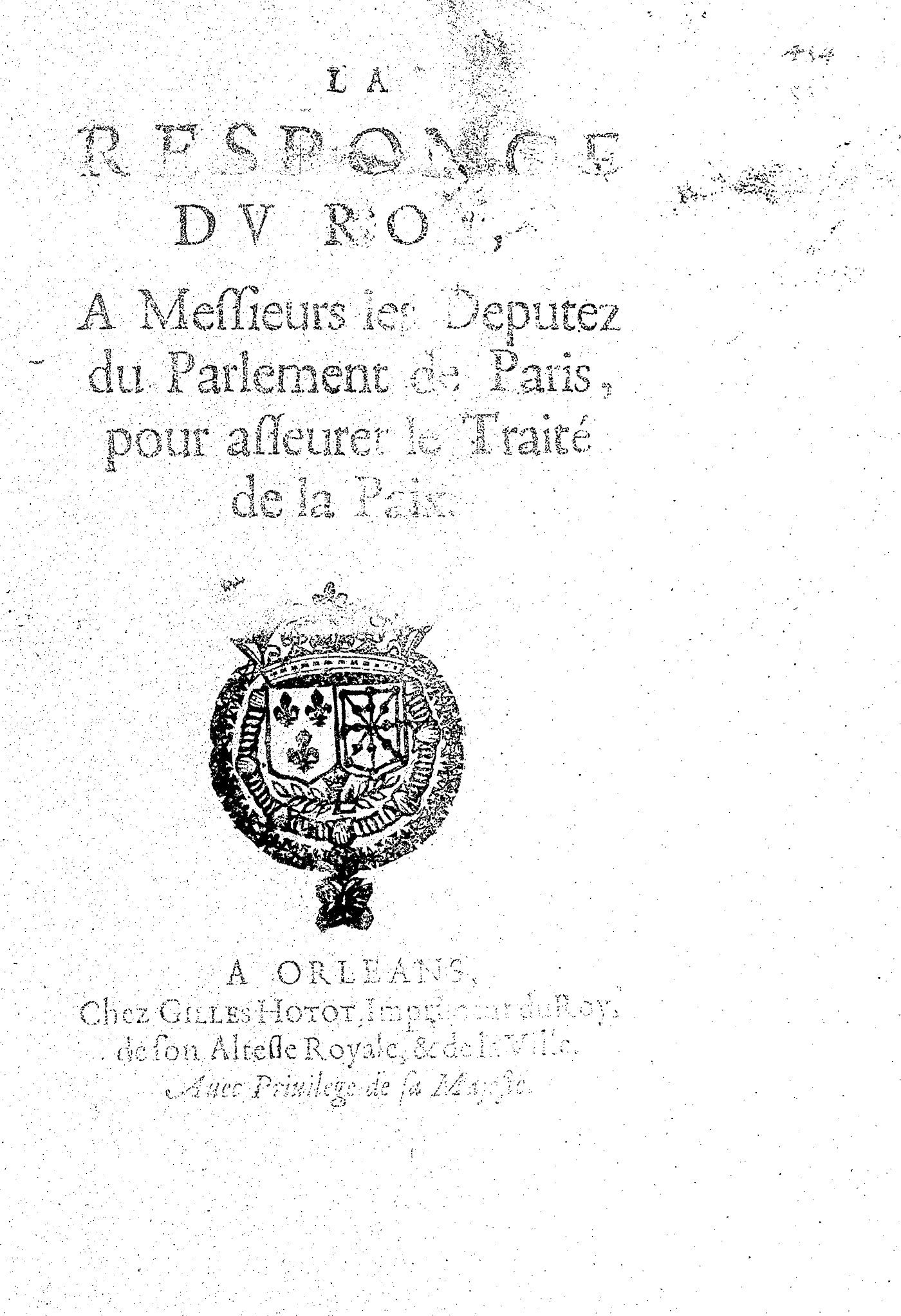 LA RESPONCE DV ROY, A Messieurs les Deputez du Parlement de Paris, pour asseurer le Traité de la Paix. Auteur : Louis (XIV), De Guénégaud [signé]