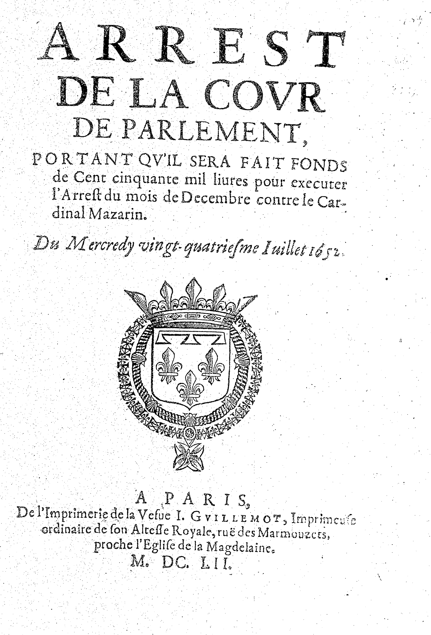 ARREST DE LA COVR DE PARLEMENT, PORTANT QV’IL SERA FAIT FONDS de Cent cinquante mil liures pour executer l’Arrest du mois de Decembre contre le Cardinal Mazarin. Auteur : Du Tillet [signé]