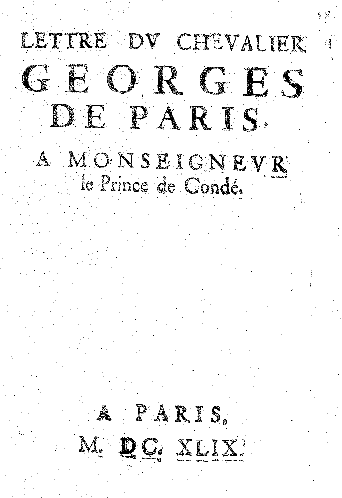 LETTRE DV CHEVALIER GEORGES DE PARIS, A MONSEIGNEVR le Prince de Condé. Auteur : Anonyme