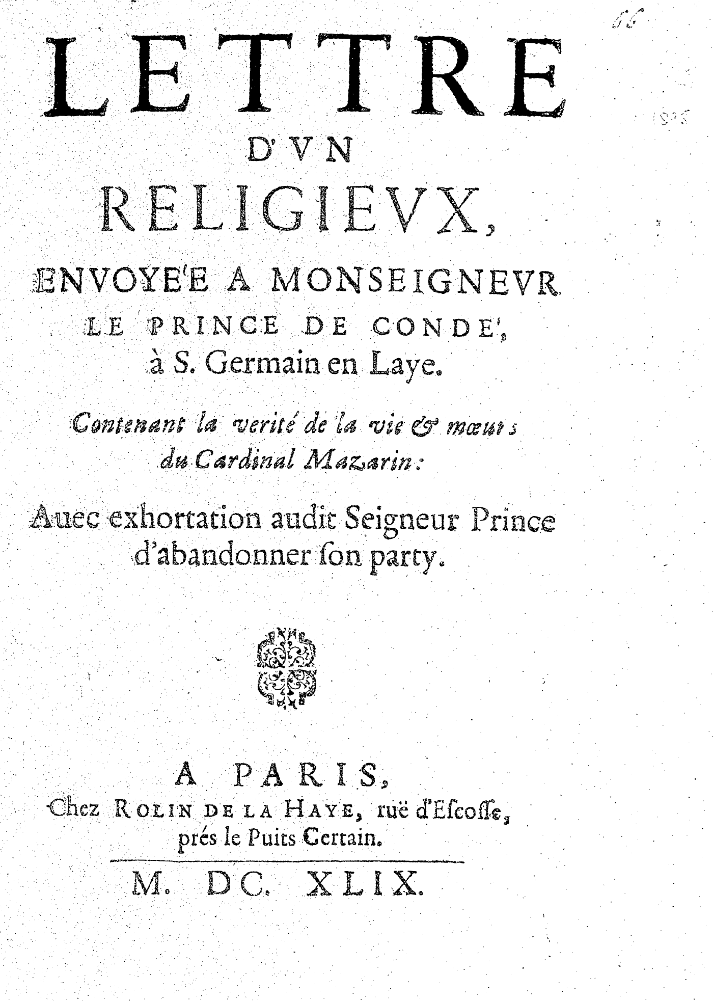 LETTRE D’VN RELIGIEVX, ENVOYÉE A MONSEIGNEVR LE PRINCE DE CONDÉ, à S. Germain en Laye. Contenant la verité de la vie & mœurs du Cardinal Mazarin : Auec exhortation audit Seigneur Prince d’abandonner son party. Auteur : Brousse, Jacques [?]