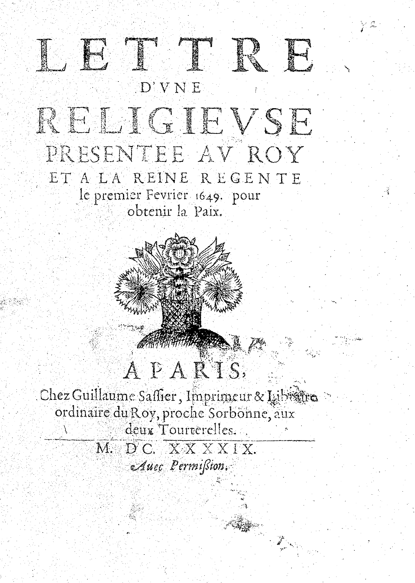 LETTRE D’VNE RELIGIEVSE PRESENTEE AV ROY ET A LA REINE REGENTE le premier Fevrier 1649. pour obtenir la Paix. Auteur : S. D. N. [signé] / Suzanne de Nervèze [?]
