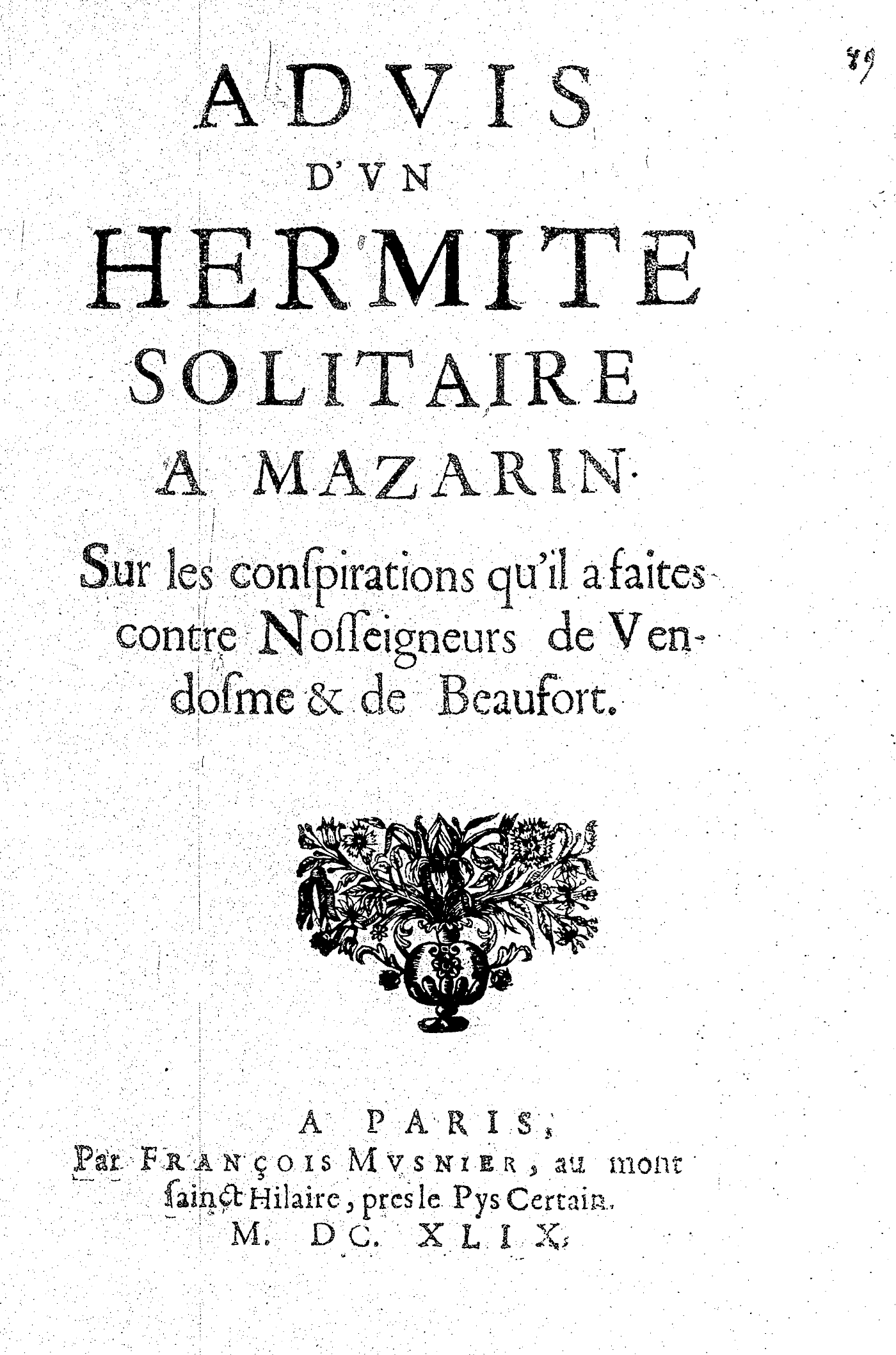 ADVIS D’VN HERMITE SOLITAIRE A MAZARIN. Sur les conspirations qu’il a faites contre Nosseigneurs de Vendosme & de Beaufort. Auteur : Anonyme