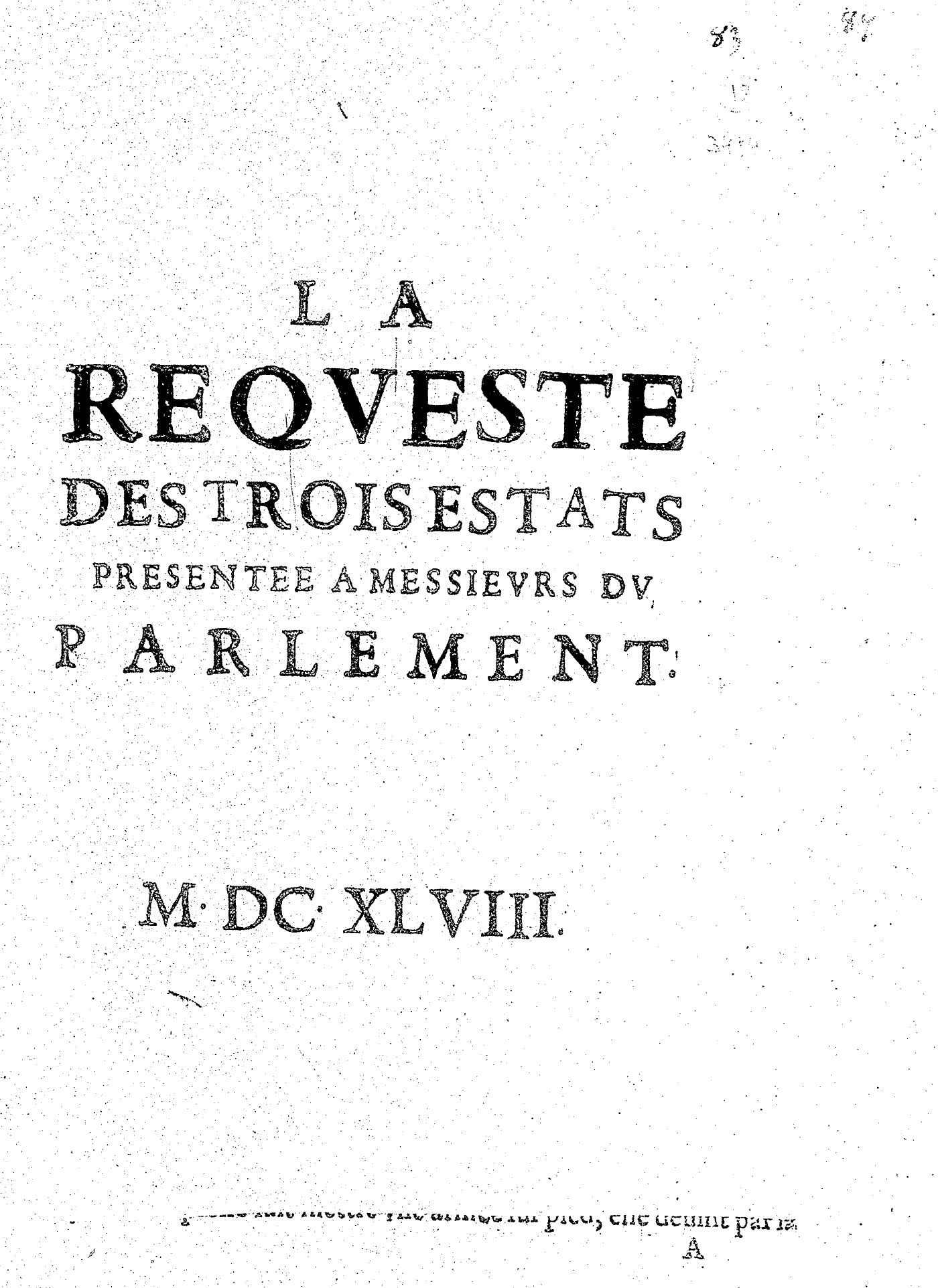 LA REQVESTE DES TROIS ESTATS PRESENTEE A MESSIEVRS DV PARLEMENT. Auteur : Anonyme