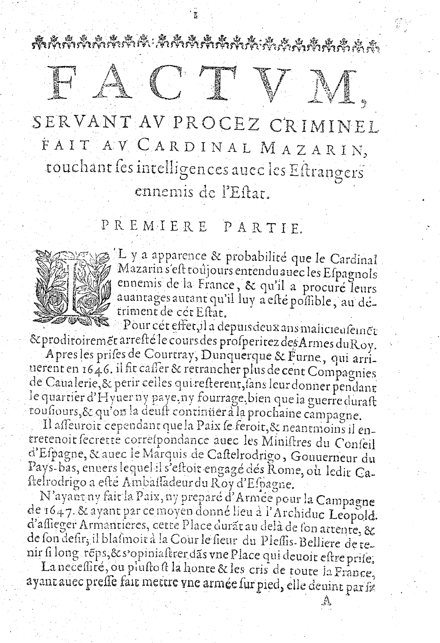 FACTVM, SERVANT AV PROCEZ CRIMINEL FAIT AV CARDINAL MAZARIN, touchant ses intelligences auec les Estrangers ennemis de l’Estat. Auteur : Anonyme