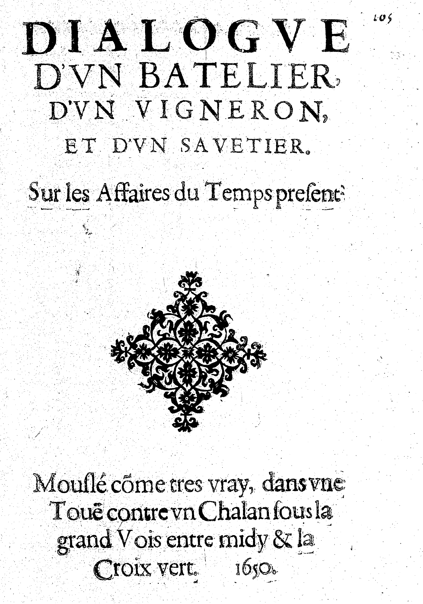 DIALOGVE D’VN BATELIER, D’VN VIGNERON, ET D’VN SAVETIER. Sur les Affaires du Temps present. Auteur : Anonyme