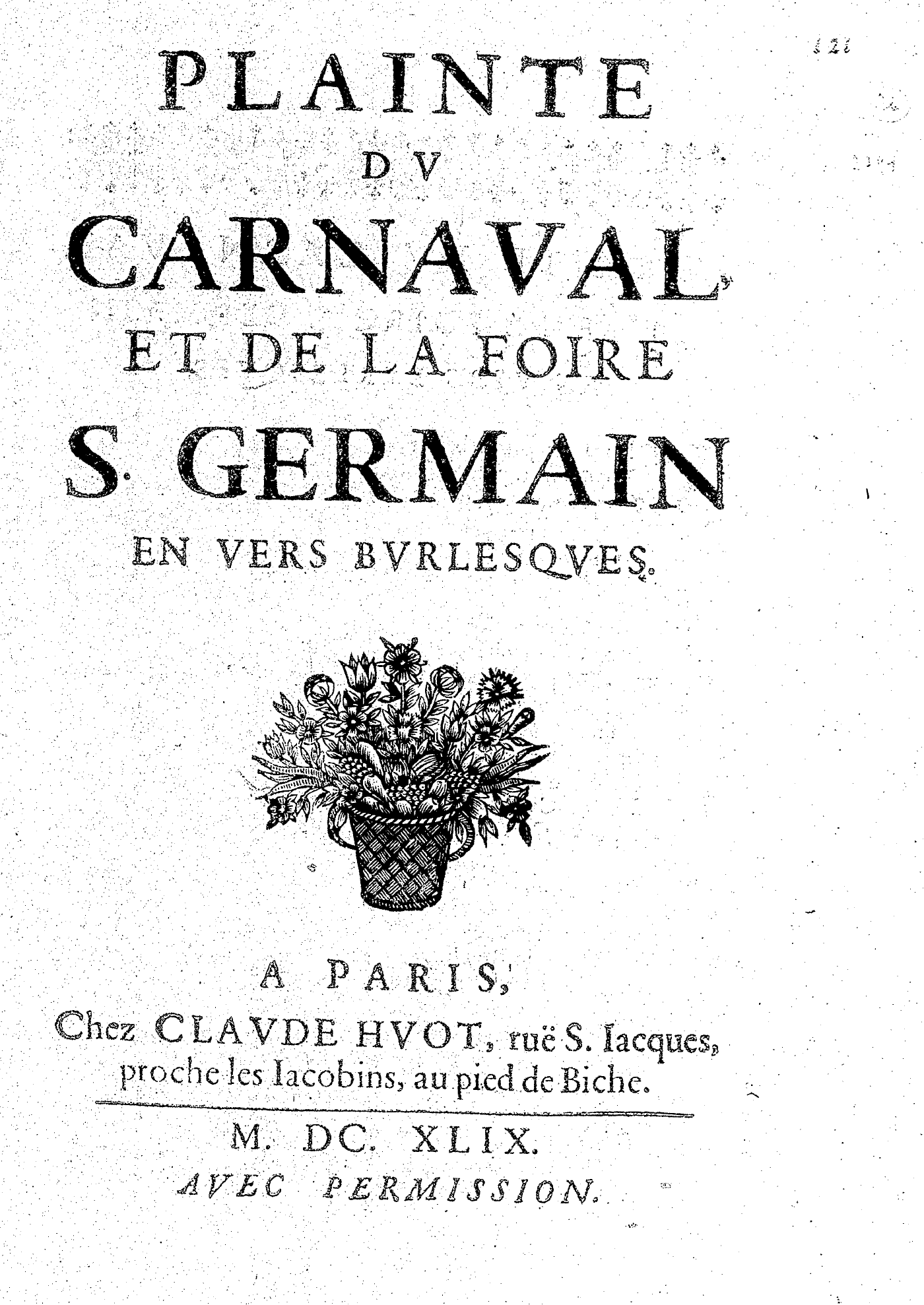 PLAINTE DV CARNAVAL, ET DE LA FOIRE S. GERMAIN EN VERS BVRLESQVES. Auteur : Laffemas, abbé Laurent de [?]
