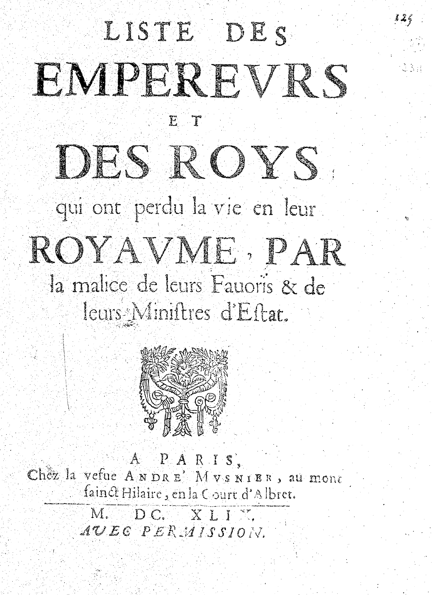 LISTE DES EMPEREVRS ET DES ROYS qui ont perdu la vie en leur ROYAVME, PAR la malice de leurs Fauoris & de leurs Ministres d’Estat. Auteur : Anonyme