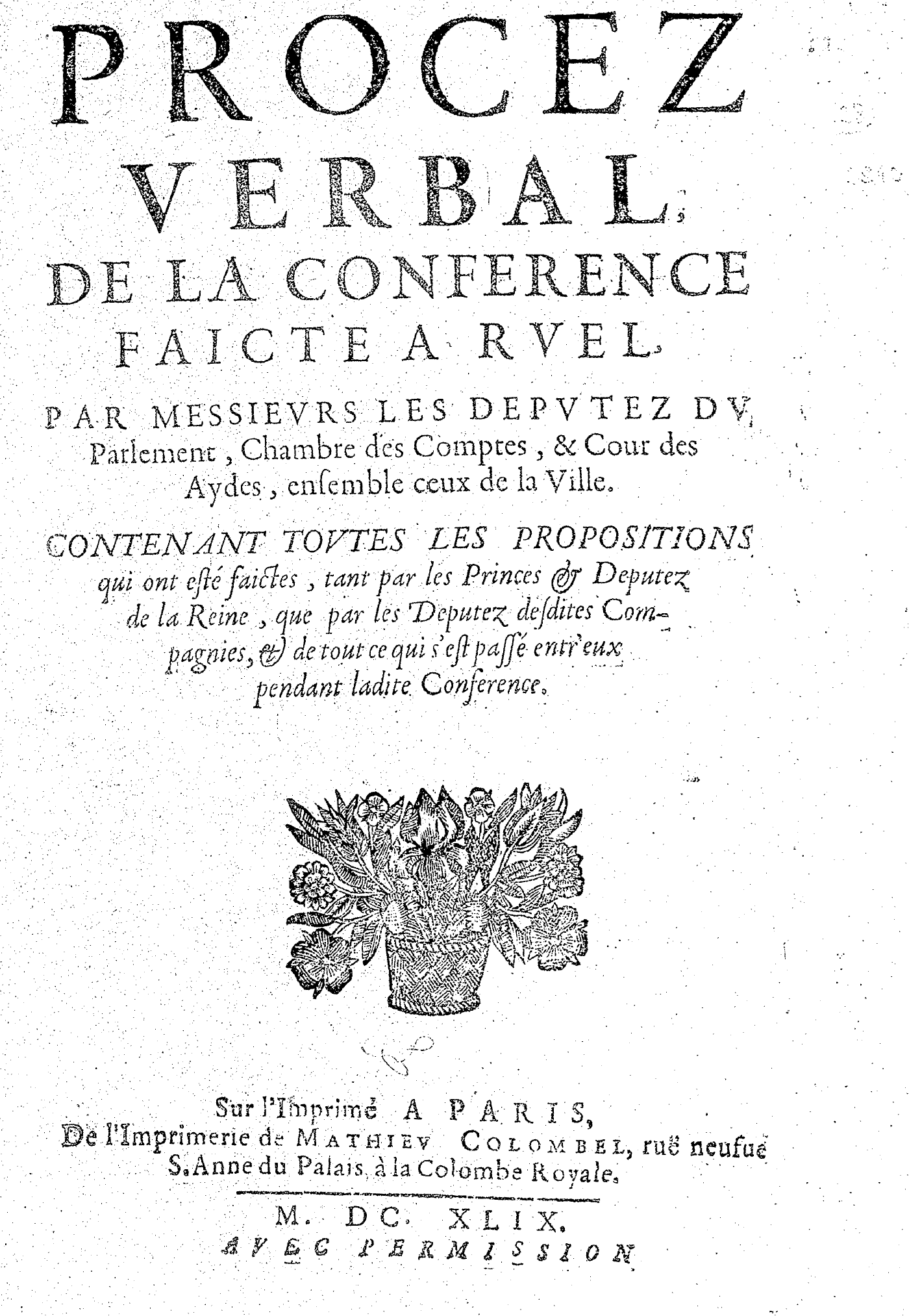 PROCEZ VERBAL, DE LA CONFERENCE FAICTE A RVEL, PAR MESSIEVRS LES DEPVTEZ DV Parlement, Chambre des Comptes, & Cour des Aydes, ensemble ceux de la Ville. CONTENANT TOVTES LES PROPOSITIONS qui ont esté faictes, tant par les Princes & Deputez de la Reine, que par les Deputez desdites Compagnies, & de tout ce qui s’est passé entr’eux pendant ladite Conference. Auteur : Anonyme
