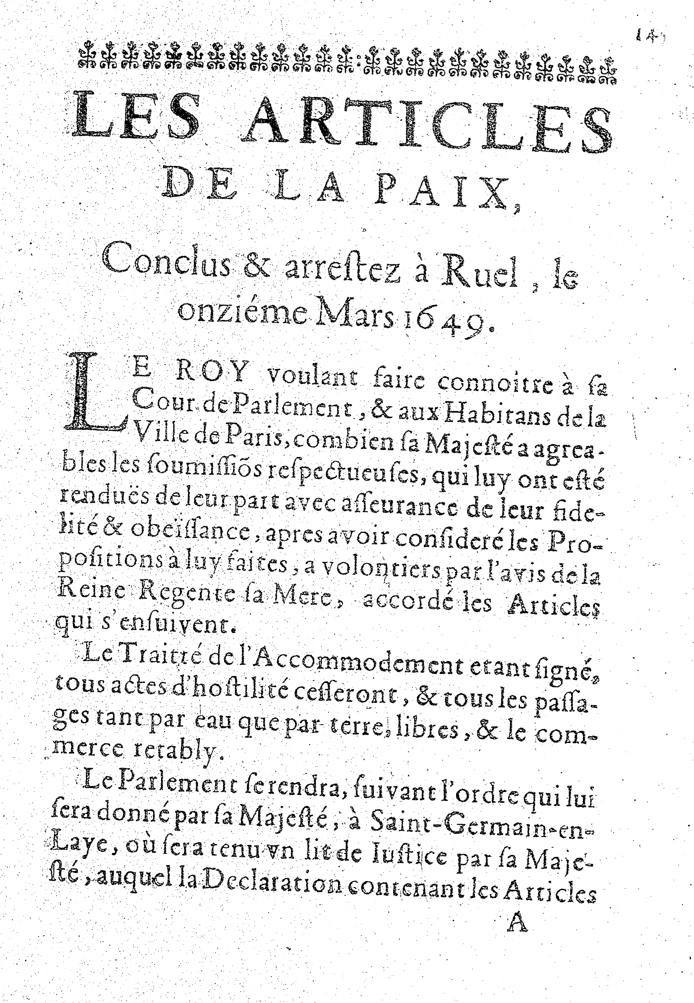 LES ARTICLES DE LA PAIX, Conclus & arrestez à Ruel, le onziéme Mars 1649. Auteur : Anonyme