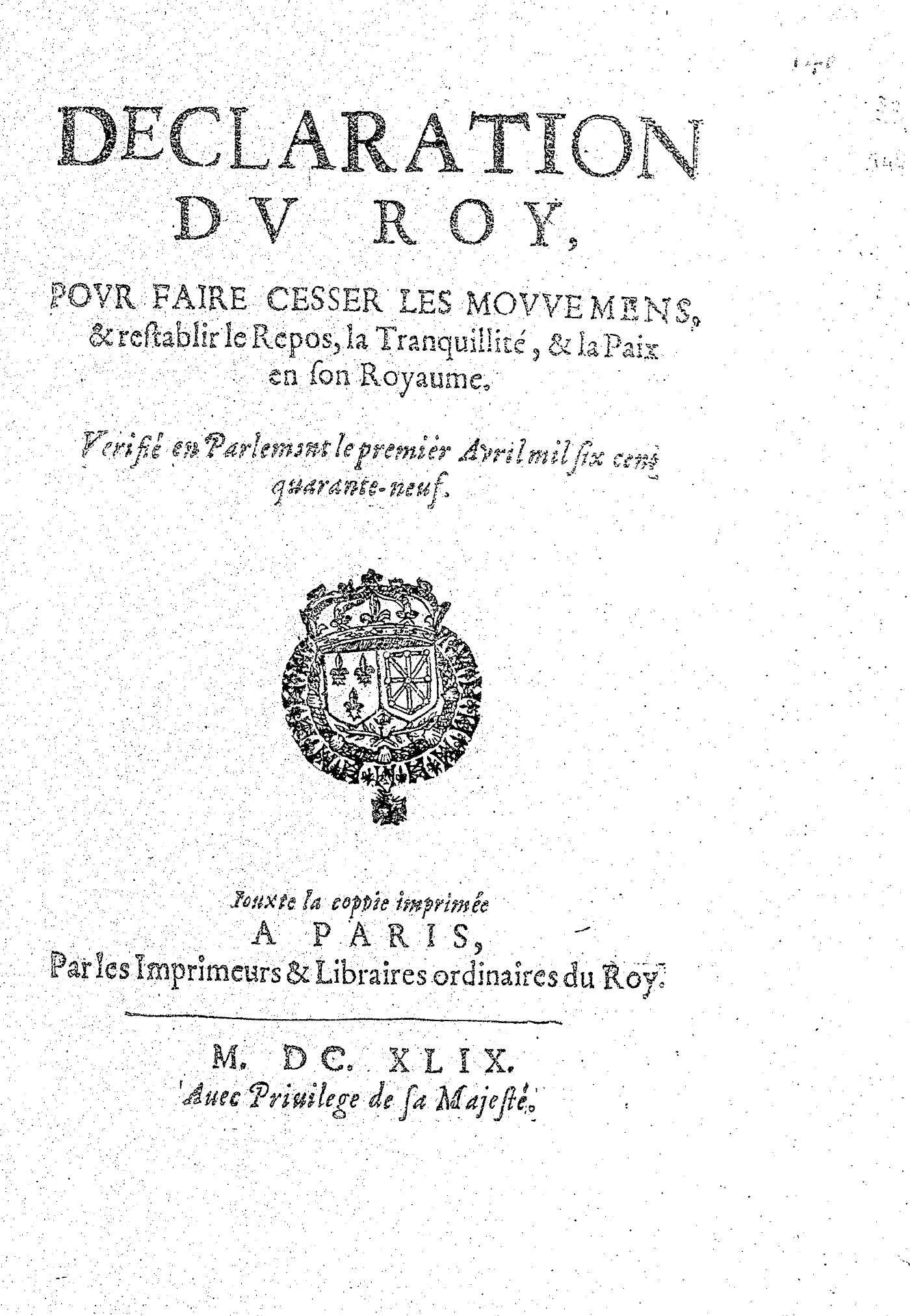 DECLARATION DV ROY, POVR FAIRE CESSER LES MOVVEMENS, & restablir le Repos, la Tranquillité, & la Paix en son Royaume. Verifié en Parlement le premier Avril mil six cent quarante-neuf. Auteur : Louis (XIV), De Guénégaud, Du Tillet [signé]