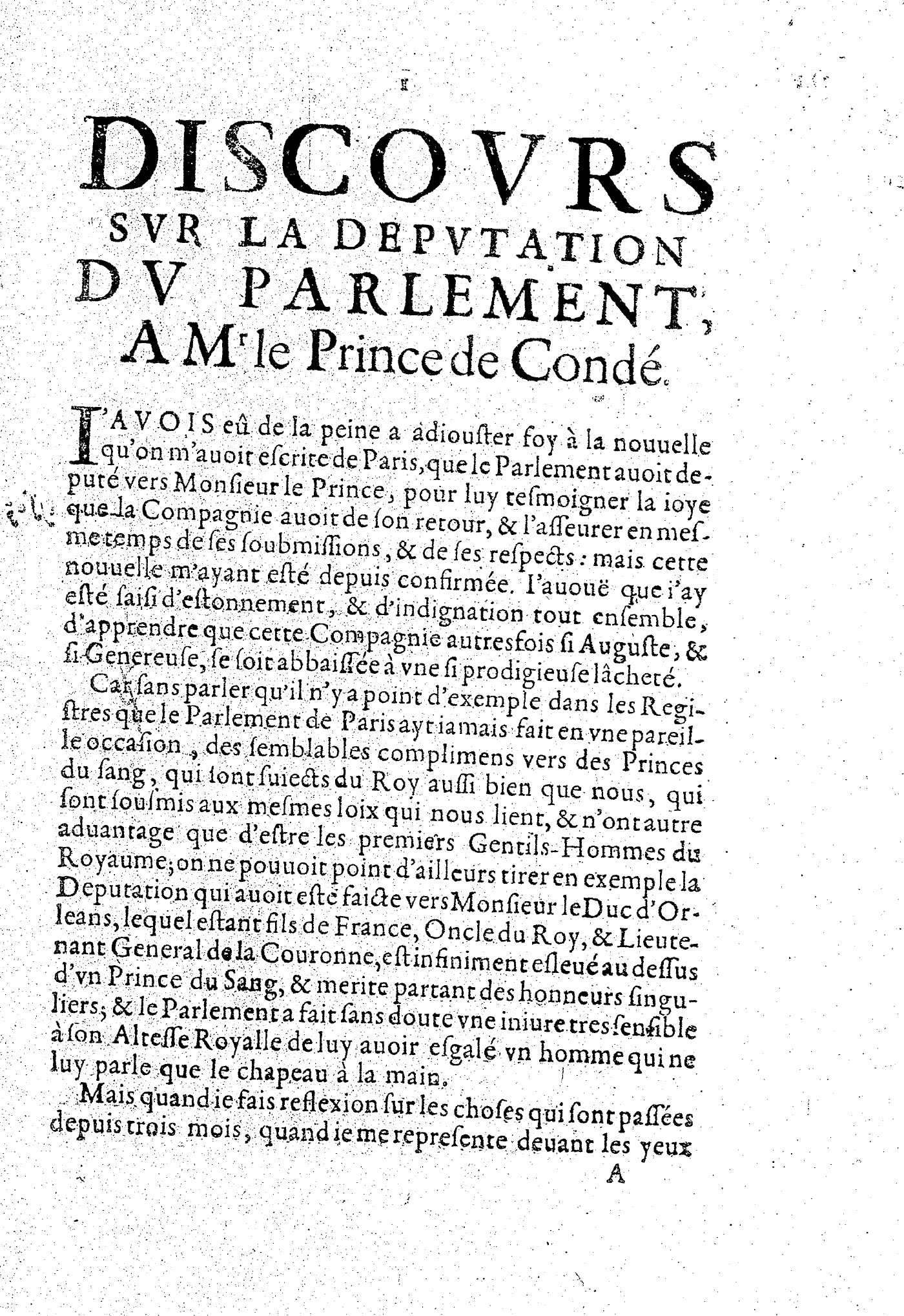 DISCOVRS SVR LA DEPVTATION DV PARLEMENT, A Mr le Prince de Condé. Auteur : Johannès, Nicolas (Sieur Du Portail) [?]