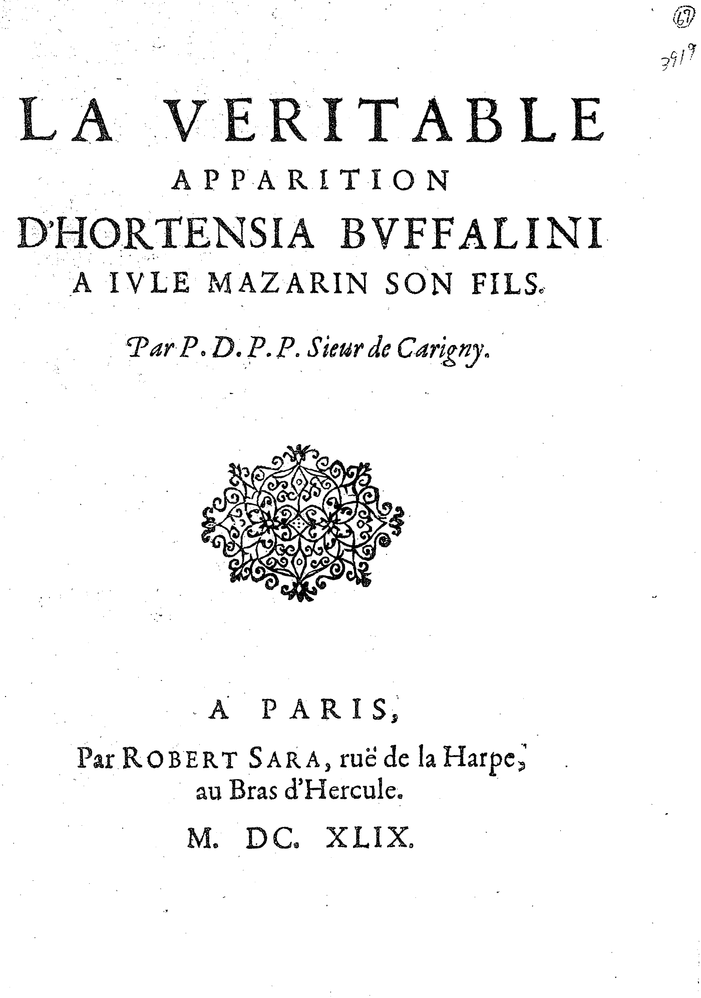 LA VERITABLE APPARITION D’HORTENSIA BVFFALINI A IVLE MAZARIN SON FILS. Par P. D. P. P. Sieur de Carigny.