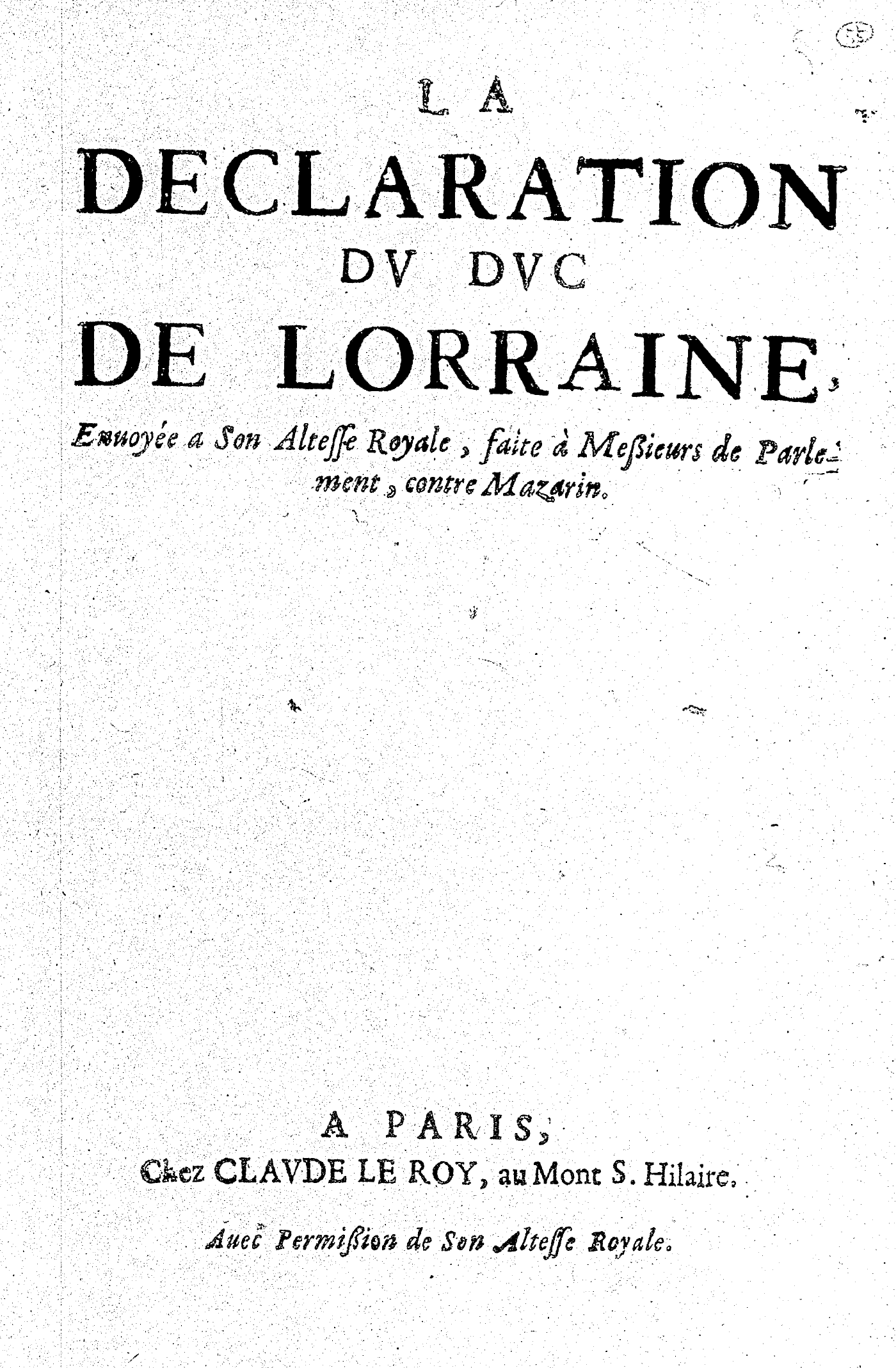 LA DECLARATION DV DVC DE LORRAINE, Enuoyée a Son Altesse Royale, faite à Messieurs de Parlement, contre Mazarin.
