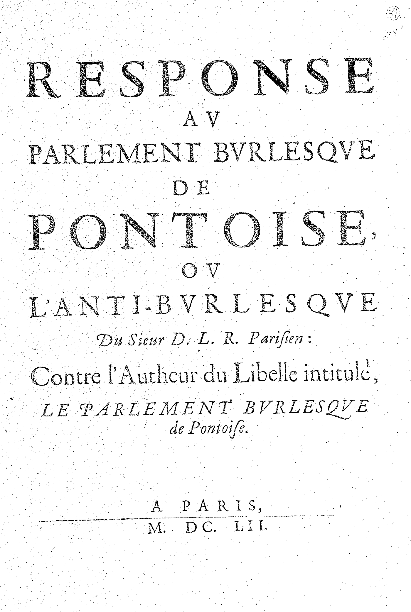 RESPONSE AV PARLEMENT BVRLESQVE DE PONTOISE, OV L’ANTI-BVRLESQVE Du Sieur D. L. R. Parisien : Contre l’Autheur du Libelle intitulé, LE PARLEMENT BVRLESQVE de Pontoise.