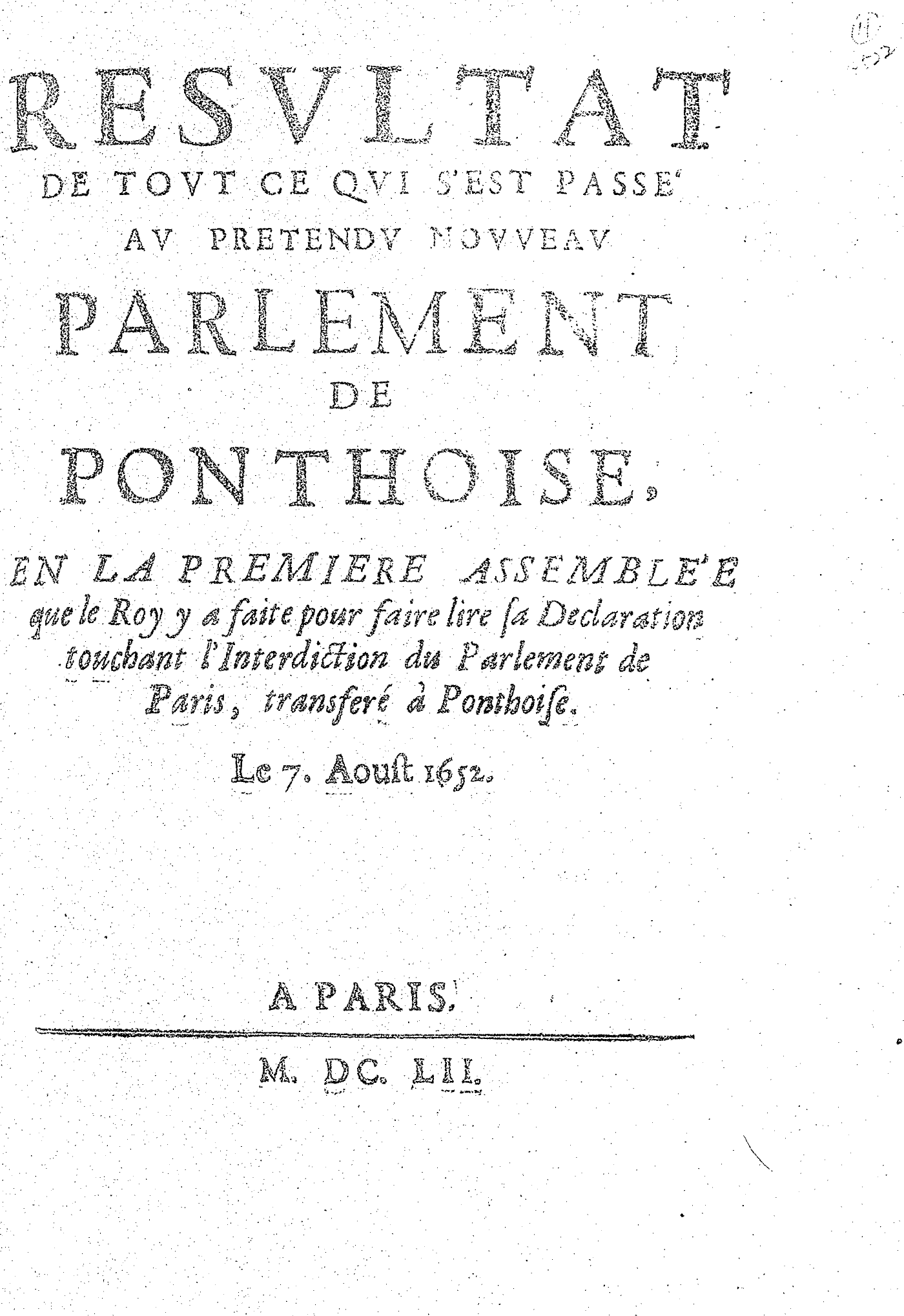 RESVLTAT DE TOVT CE QVI S’EST PASSÉ AV PRETENDV NOVVEAV PARLEMENT DE PONTHOISE, EN LA PREMIERE ASSEMBLÉE que le Roy y a faite pour faire lire sa Declaration touchant l’Interdiction du Parlement de Paris, transferé à Ponthoise. Le 7. Aoust 1652.