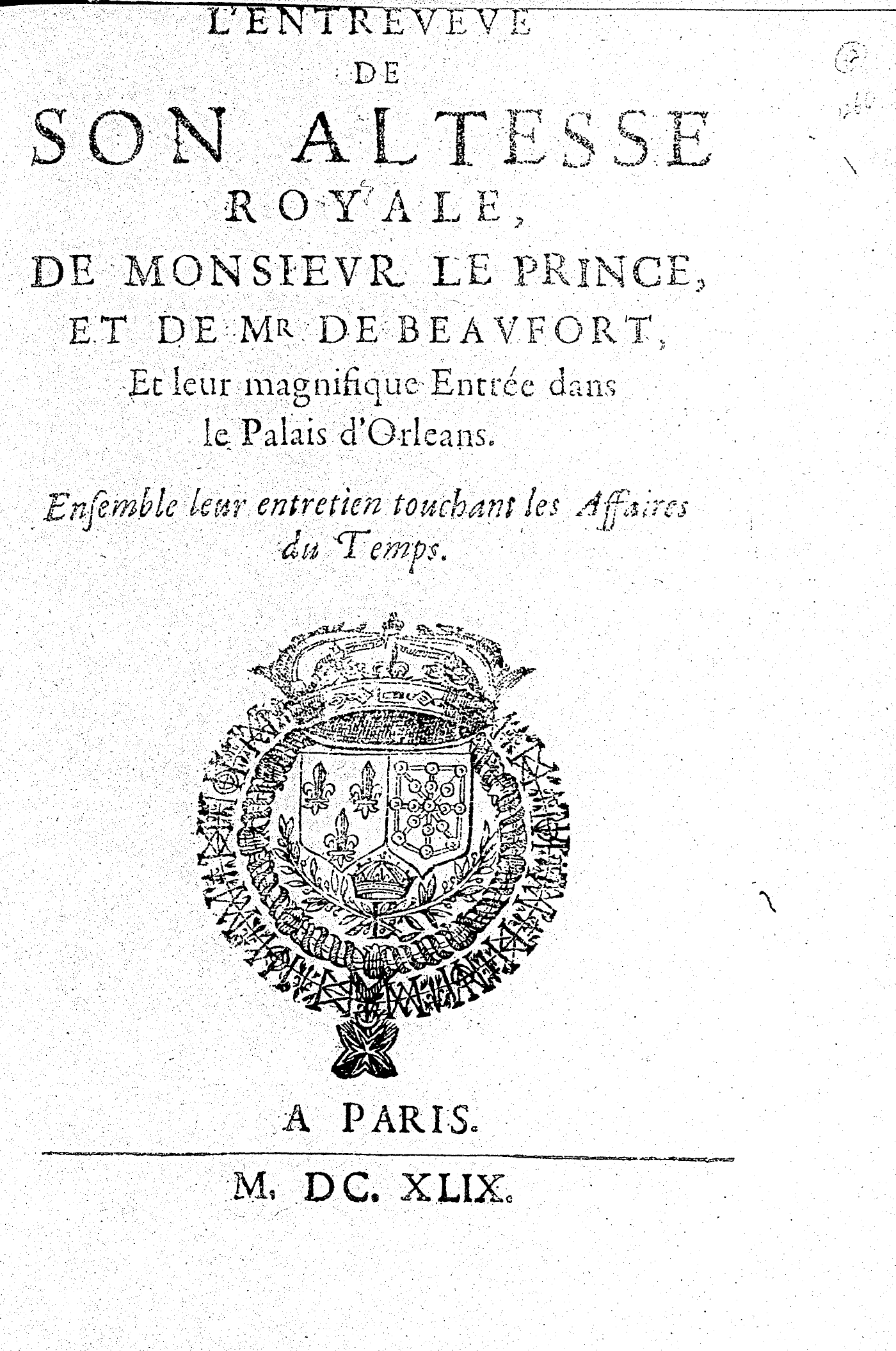 L’ENTREVEVE DE SON ALTESSE ROYALE, DE MONSIEVR LE PRINCE, ET DE MR. DE BEAVFORT, Et leur magnifique Entrée dans le Palais d’Orleans. Ensemble leur entretien touchant les Affaires du Temps.