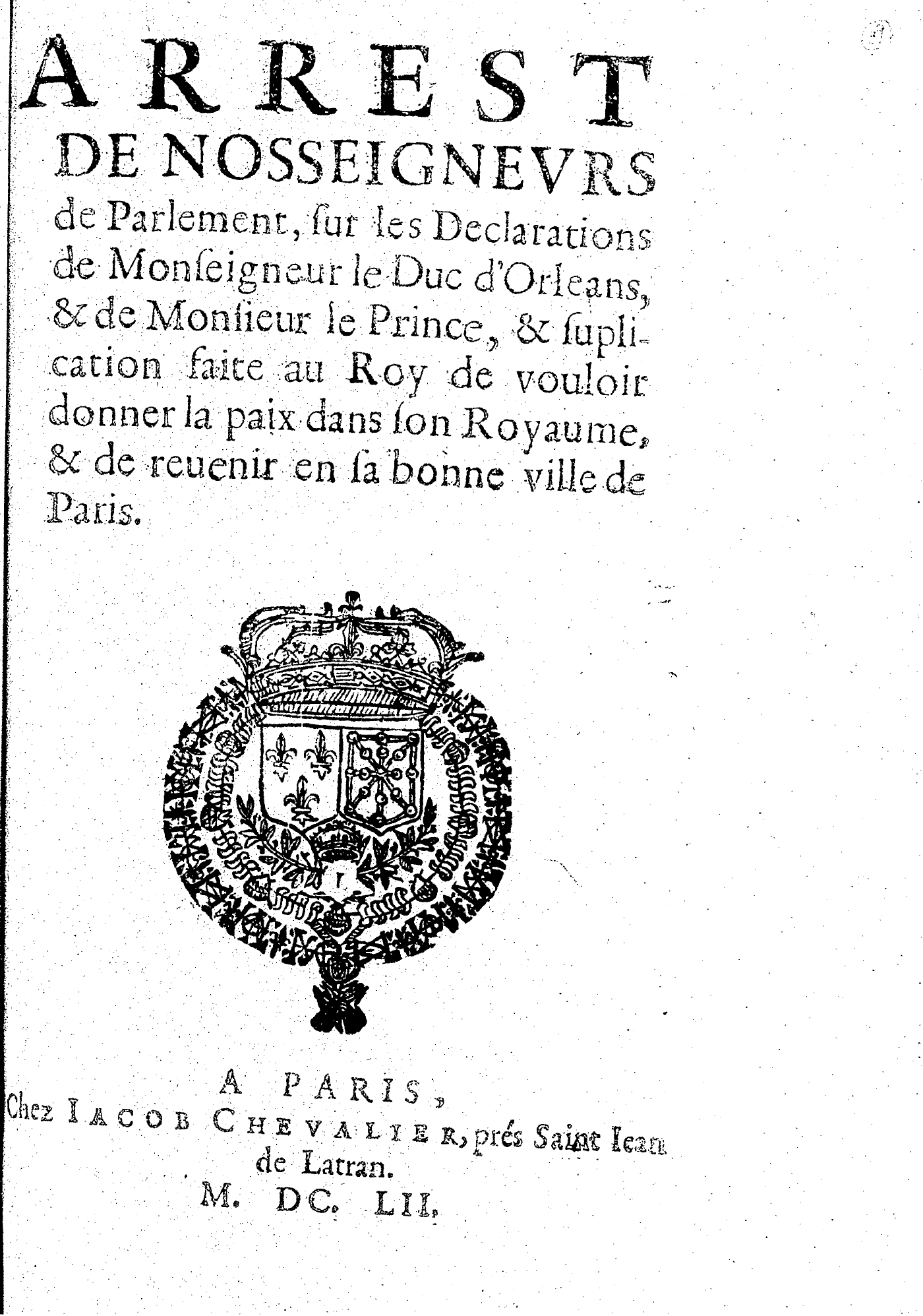 ARREST DE NOSSEIGNEVRS de Parlement, sur les Declarations de Monseigneur le Duc d’Orleans, & de Monsieur le Prince, & suplication faite au Roy de vouloir donner la paix dans son Royaume, & de reuenir en sa bonne ville de Paris.