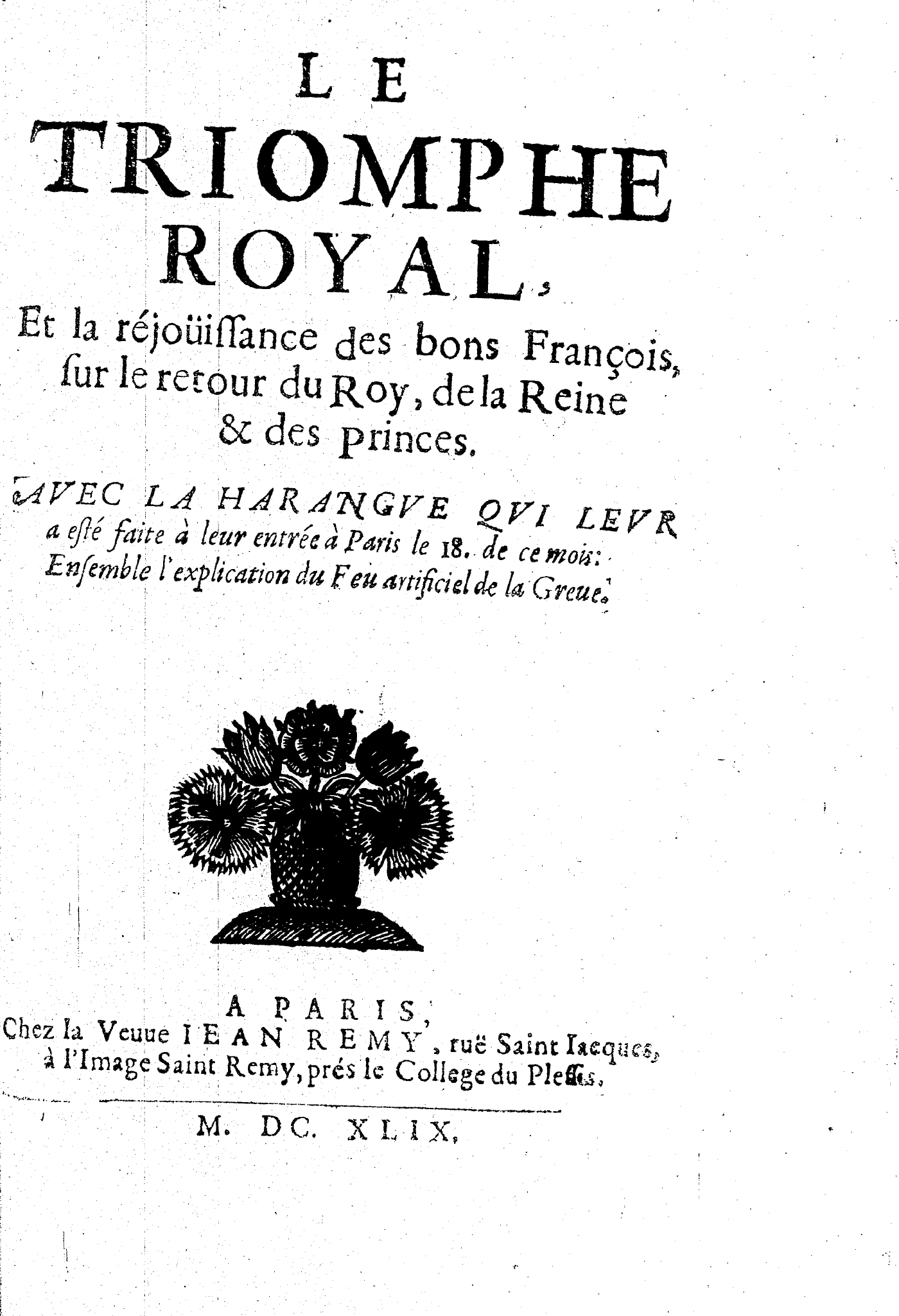 LE TRIOMPHE ROYAL, Et la réjoüissance des bons François, sur le retour du Roy, de la Reine & des princes. AVEC LA HARANGVE QVI LEVR a esté faite à leur entrée à Paris le 18. de ce mois : Ensemble l’explication du Feu artificiel de la Greue.