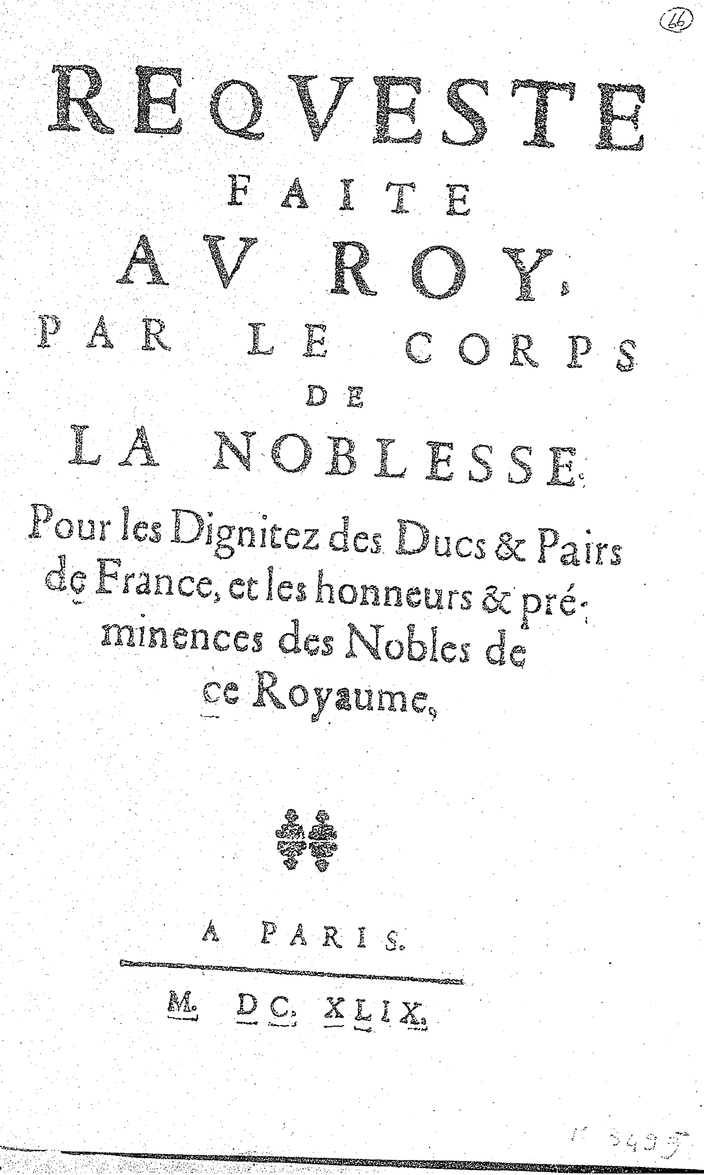REQVESTE FAITE AV ROY, PAR LE CORPS DE LA NOBLESSE. Pour les Dignitez des Ducs & Pairs de France, et les honneurs & préminences des Nobles de ce Royaume.
