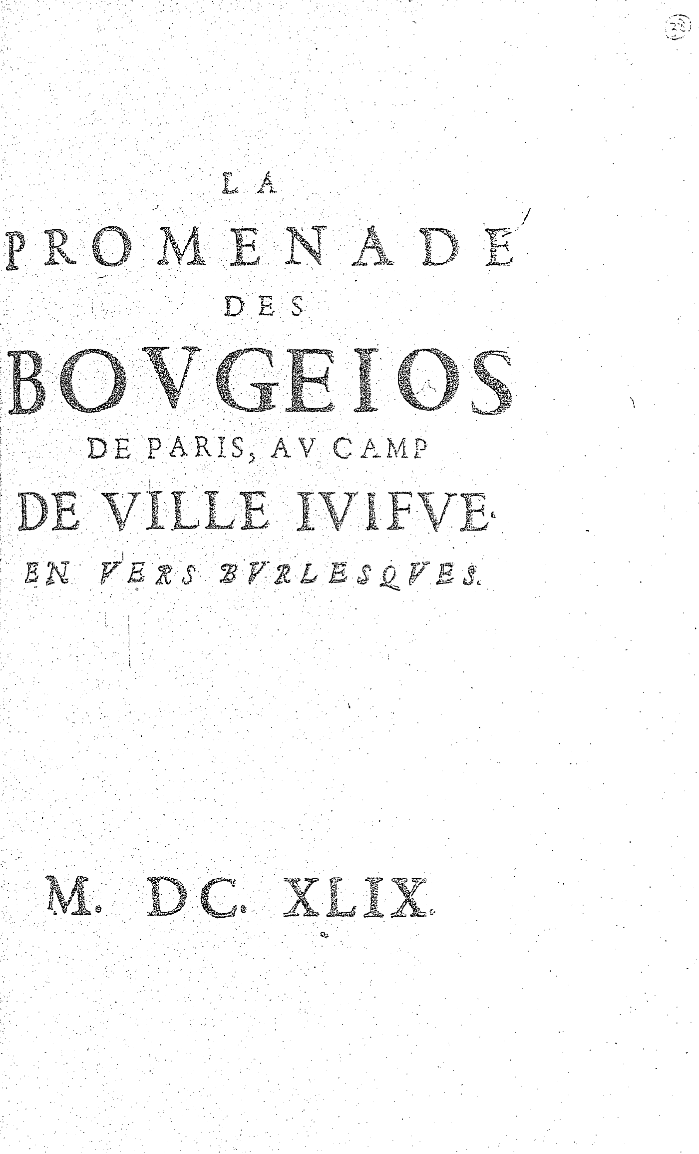 LA PROMENADE DES BOVGEIOS DE PARIS, AV CAMP DE VILLE IVIFVE. EN VERS BVRLESQVES.