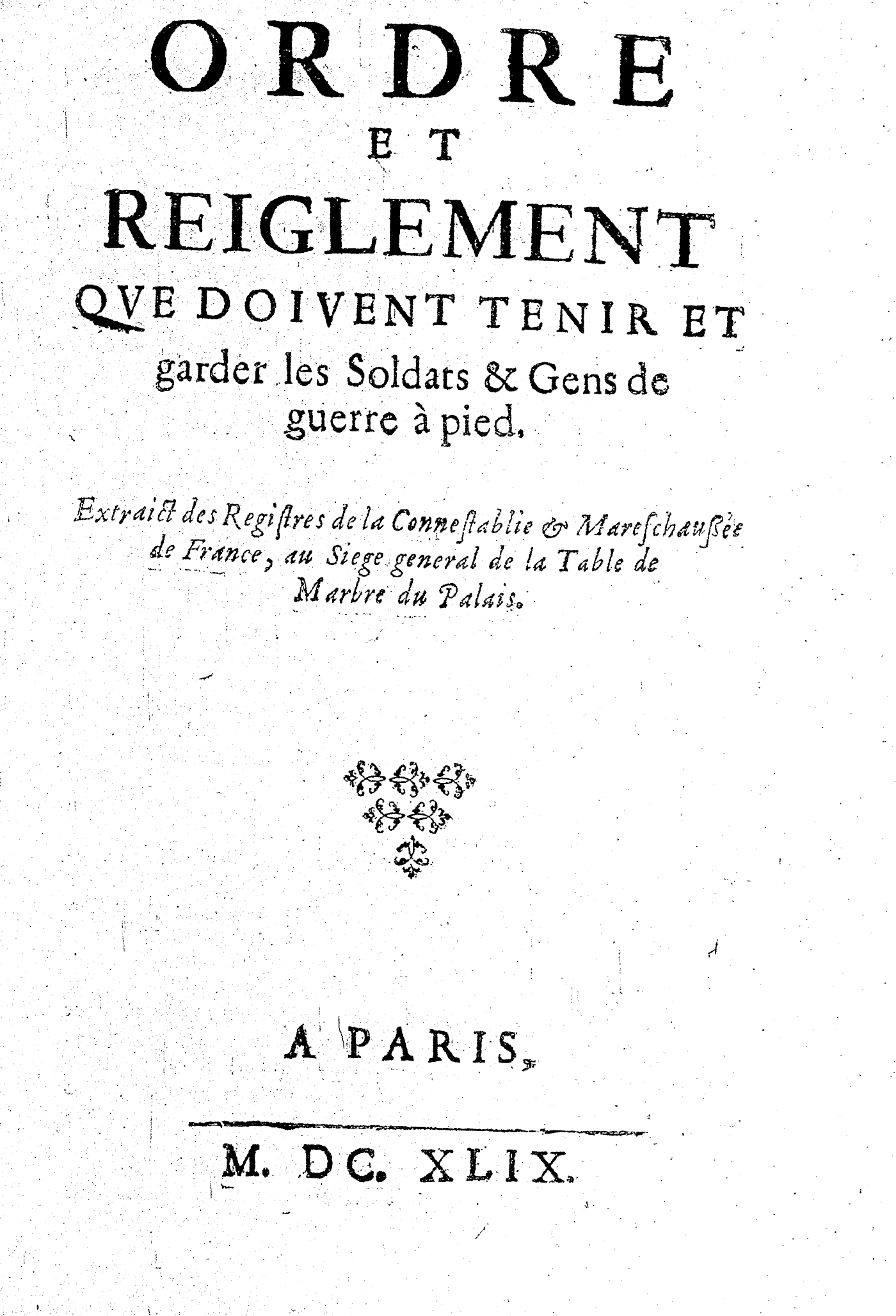 ORDRE ET REIGLEMENT QVE DOIVENT TENIR ET garder les Soldats & Gens de guerre à pied. Extraict des Registres de la Connestablie & Mareschaussée de France, au Siege general de la Table de Marbre du Palais.