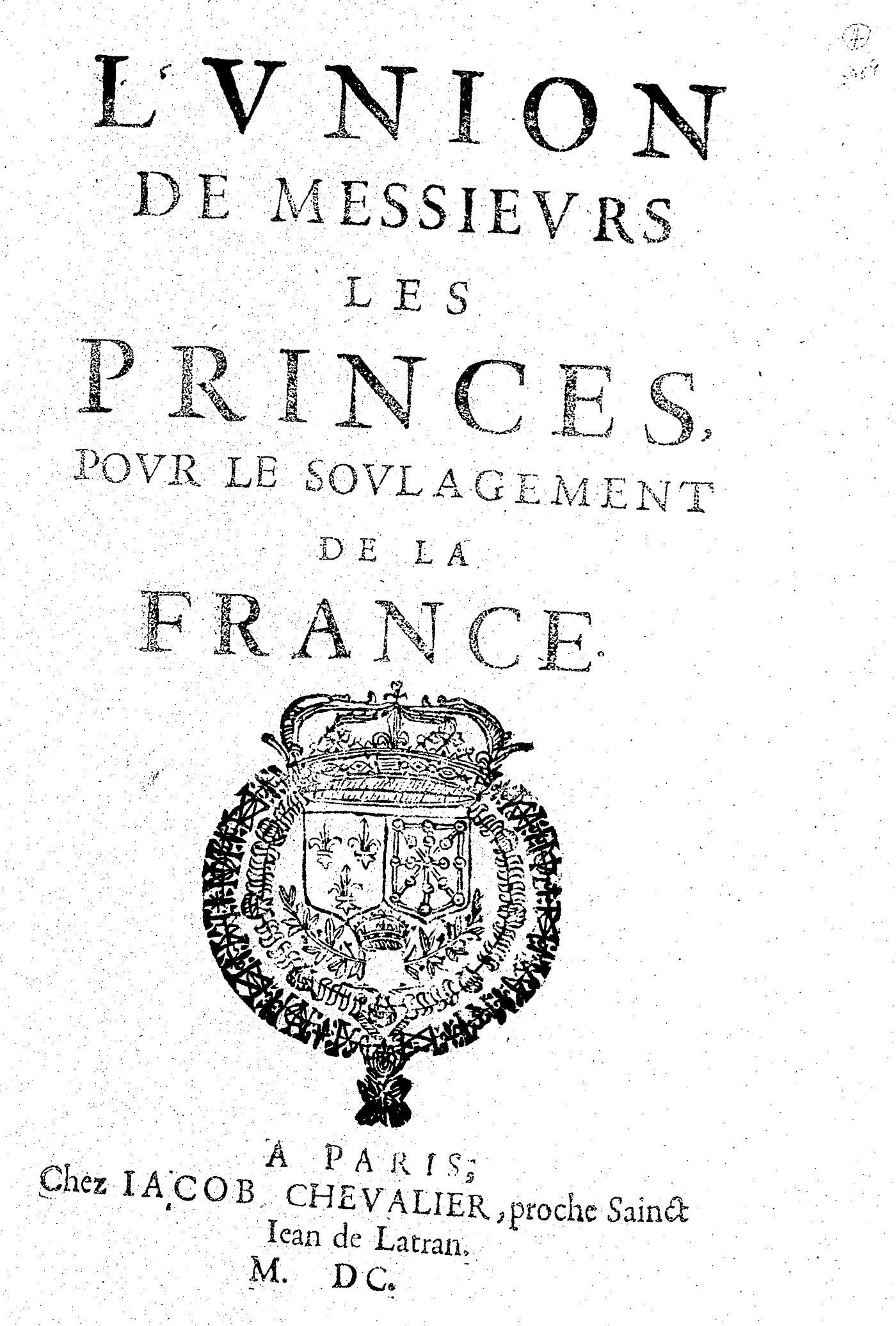 L’VNION DE MESSIEVRS LES PRINCES, POVR LE SOVLAGEMENT DE LA FRANCE.