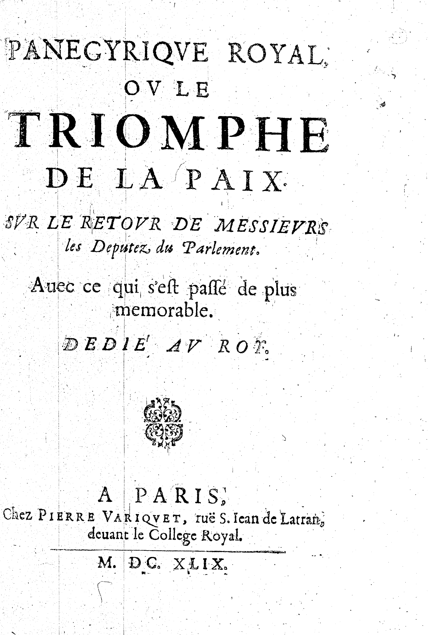 PANEGYRIQVE ROYAL, OV LE TRIOMPHE DE LA PAIX. SVR LE RETOVR DE MESSIEVRS les Deputez du Parlement. Auec ce qui s’est passé de plus memorable. DEDIÉ AV ROY.