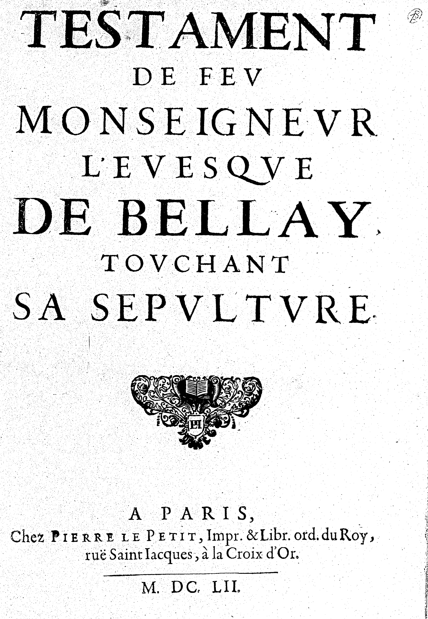TESTAMENT DE FEV MONSEIGNEVR L’EVESQVE DE BELLAY, TOVCHANT SA SEPVLTVRE.
