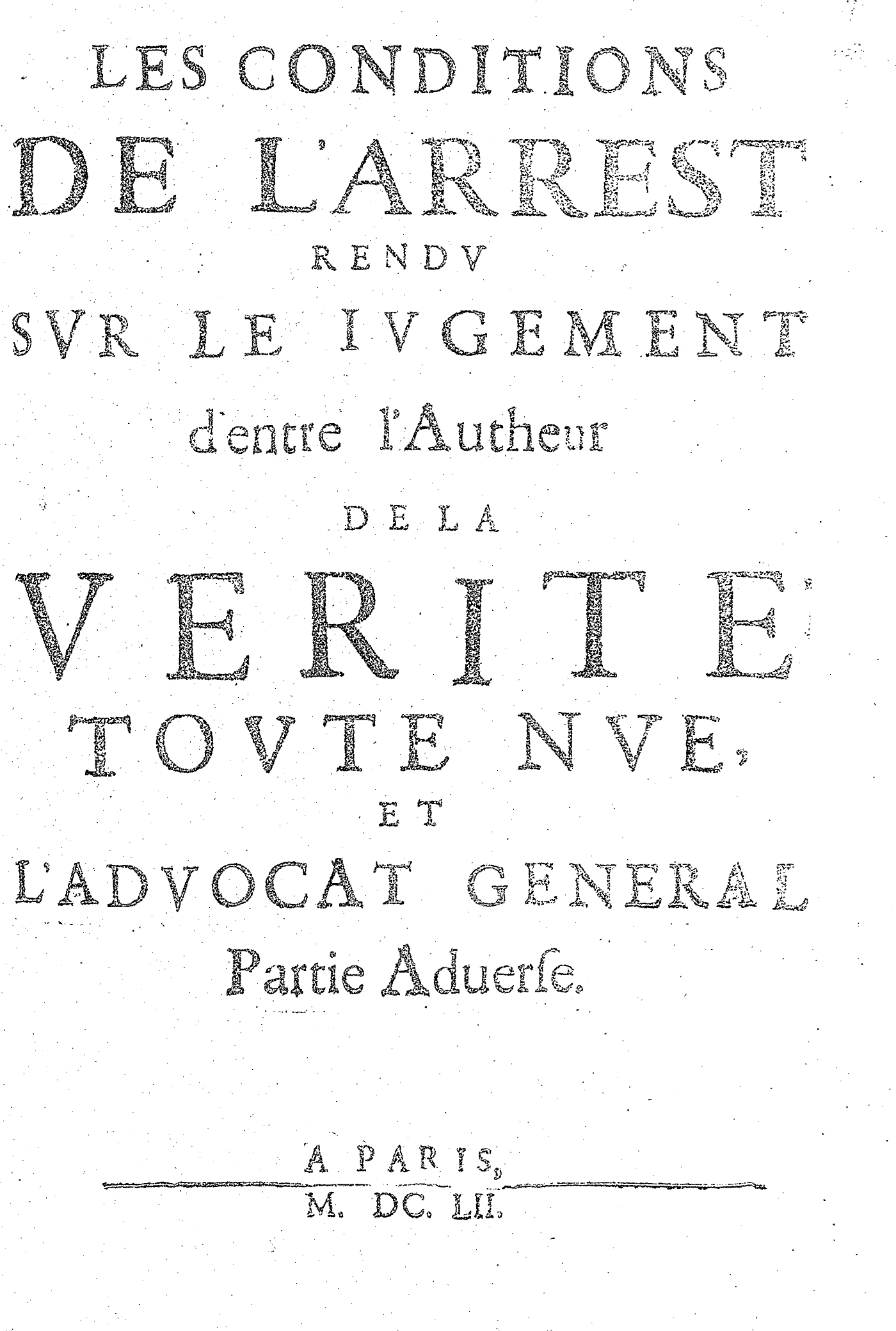 LES CONDITIONS DE L’ARREST RENDV SVR LE IVGEMENT d’entre l’Autheur DE LA VERITÉ TOVTE NVE, ET L’ADVOCAT GENERAL Partie Aduerse.