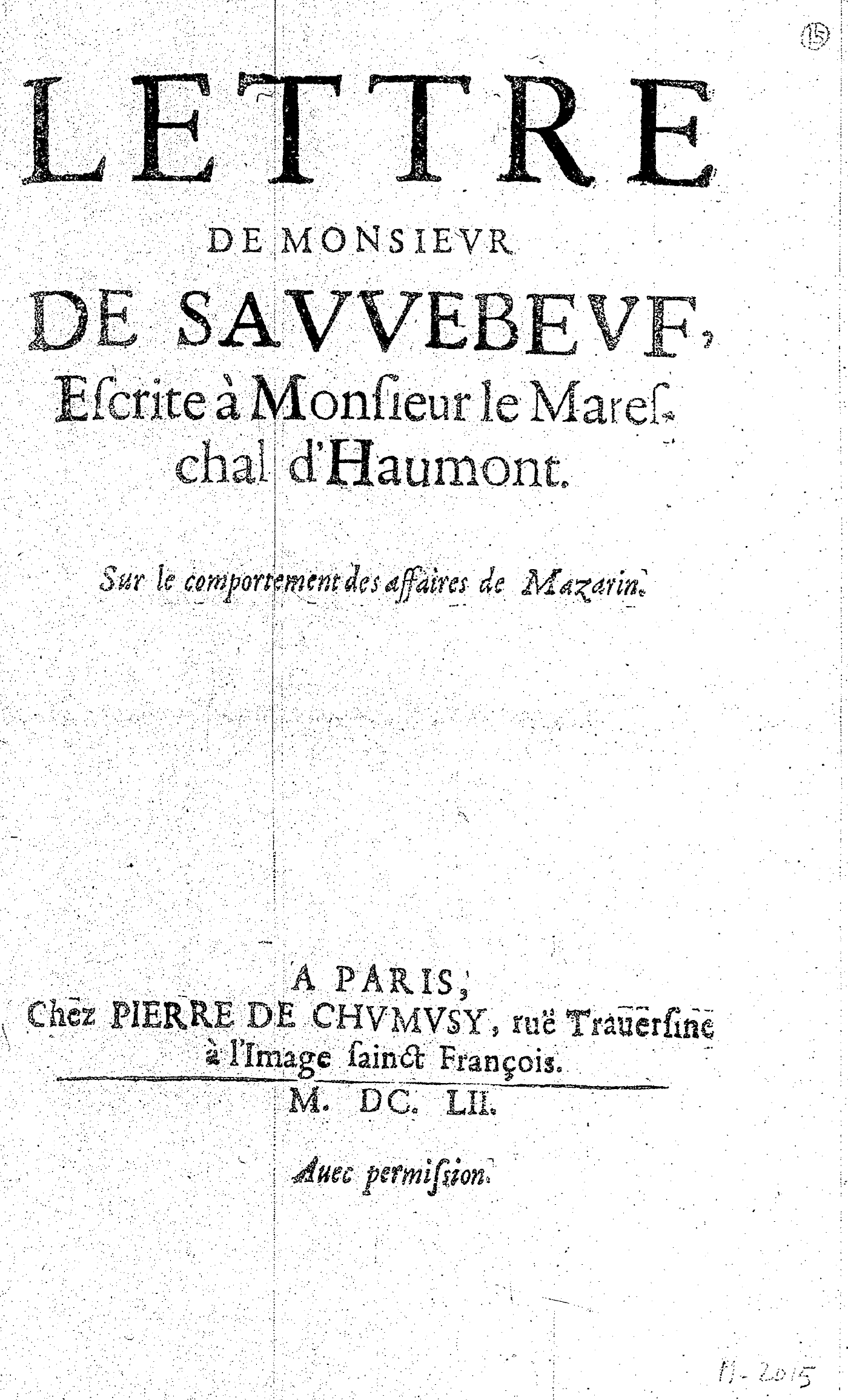 LETTRE DE MONSIEVR DE SAVVEBEVF, Escrite à Monsieur le Mareschal d’Haumont. Sur le comportement des affaires de Mazarin.
